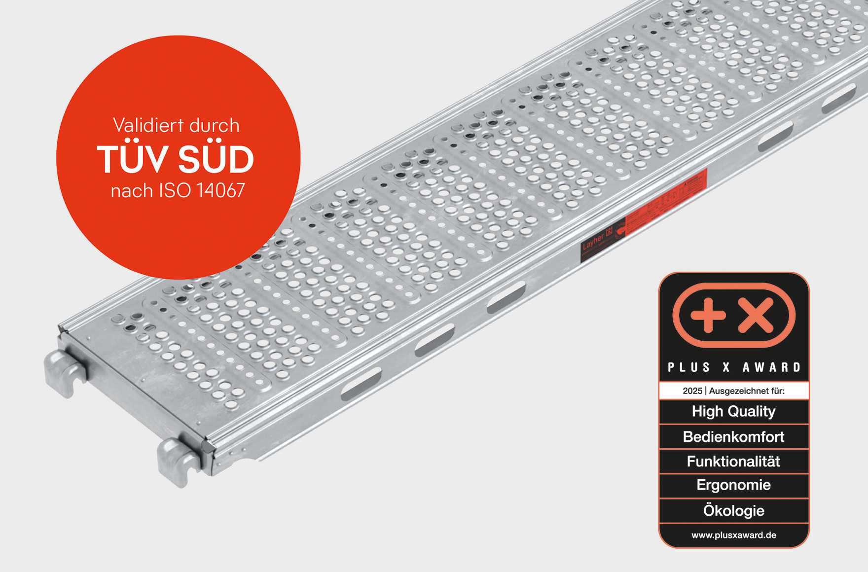 „Leicht im Gewicht, stark in der Funktion und verantwortungsvoll in der Nachhaltigkeit. Ein Produkt, das den Alltag von Gerüstbauern spürbar erleichtert und gleichzeitig einen Beitrag zur Ressourcenschonung leistet.“ Mit diesem Juryzitat wurden dem CO2-reduzierten Stahlboden LW von Layher als Variante des Stahlbodens in der Lightweight-Technologie (LW) kürzlich mehrere Gütesiegel des PLUS X AWARD in den Kategorien High Quality, Bedienkomfort, Funktionalität, Ergonomie und Ökologie verliehen. Damit stellt der Systemgerüstspezialist seine Innovationsführerschaft erneut unter Beweis: „Unser Ziel ist der Erfolg unserer Kunden. Mit dem neuen CO2-reduzierten Stahlboden LW haben wir auf der bauma eine weitere Möglichkeit vorgestellt, mit der unsere Kunden ihre Wettbewerbsfähigkeit und damit ihre Zukunftsfähigkeit am Markt stärken können. Nach ersten erfolgreichen Praxiseinsätzen durch unsere Kunden wurde dies jetzt auch von unabhängiger Stelle bestätigt“, freut sich Layher Geschäftsführer Wolf Christian Behrbohm.