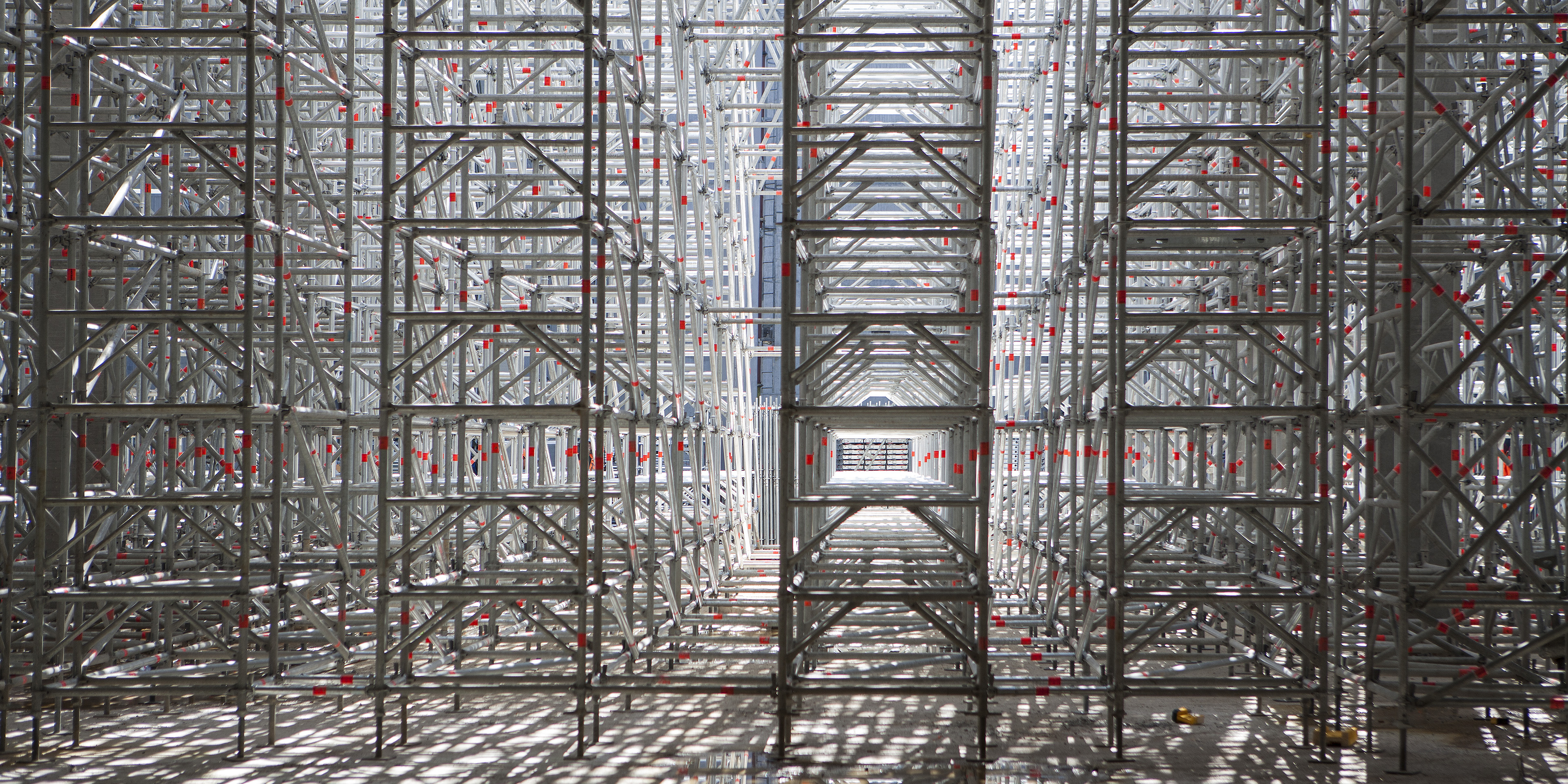 Traggerüsttürme TG 60 werden durch Allround Riegel und Diagonalen im Layher System­maß verbunden und ausgesteift und somit zum Raum­gerüst ausgebaut. Dadurch entstehen sehr tragfähige Gerüst­konstruktionen – auch für sehr große Unter­stützungs­höhen.