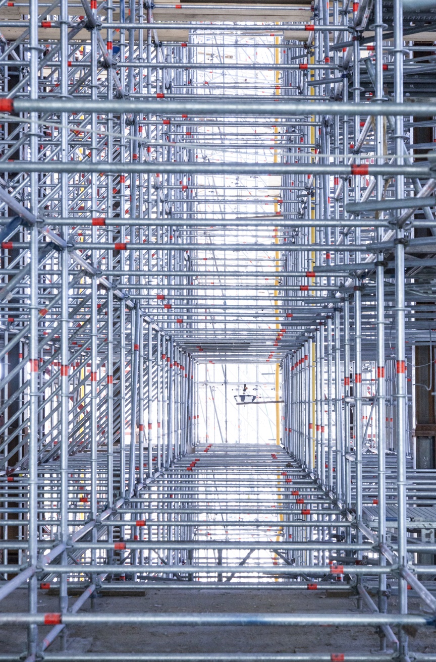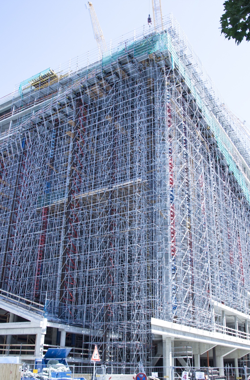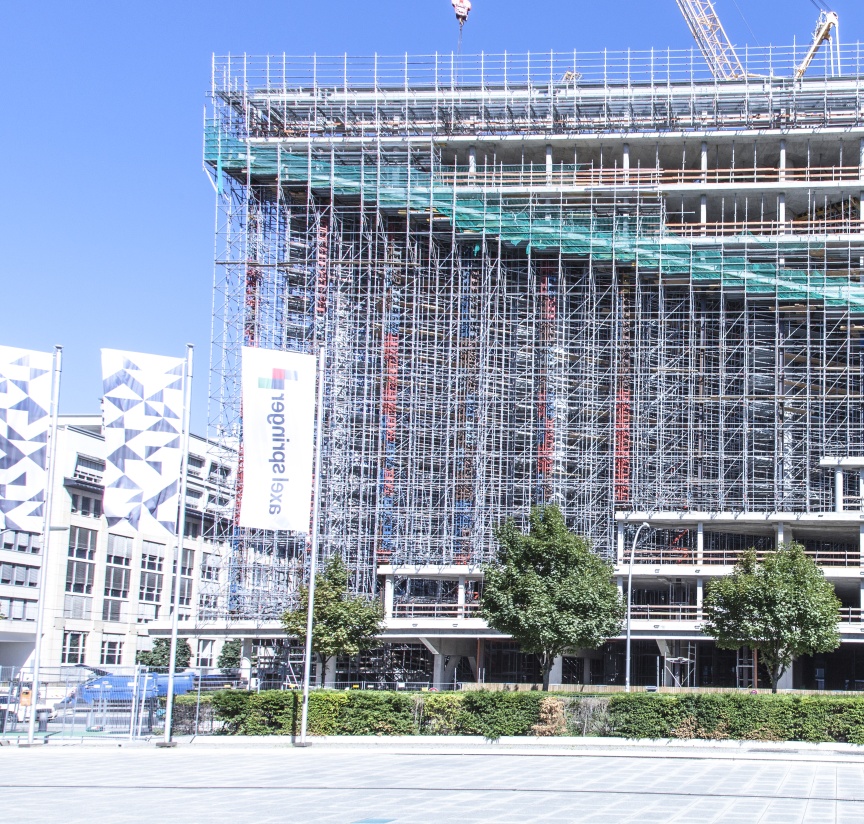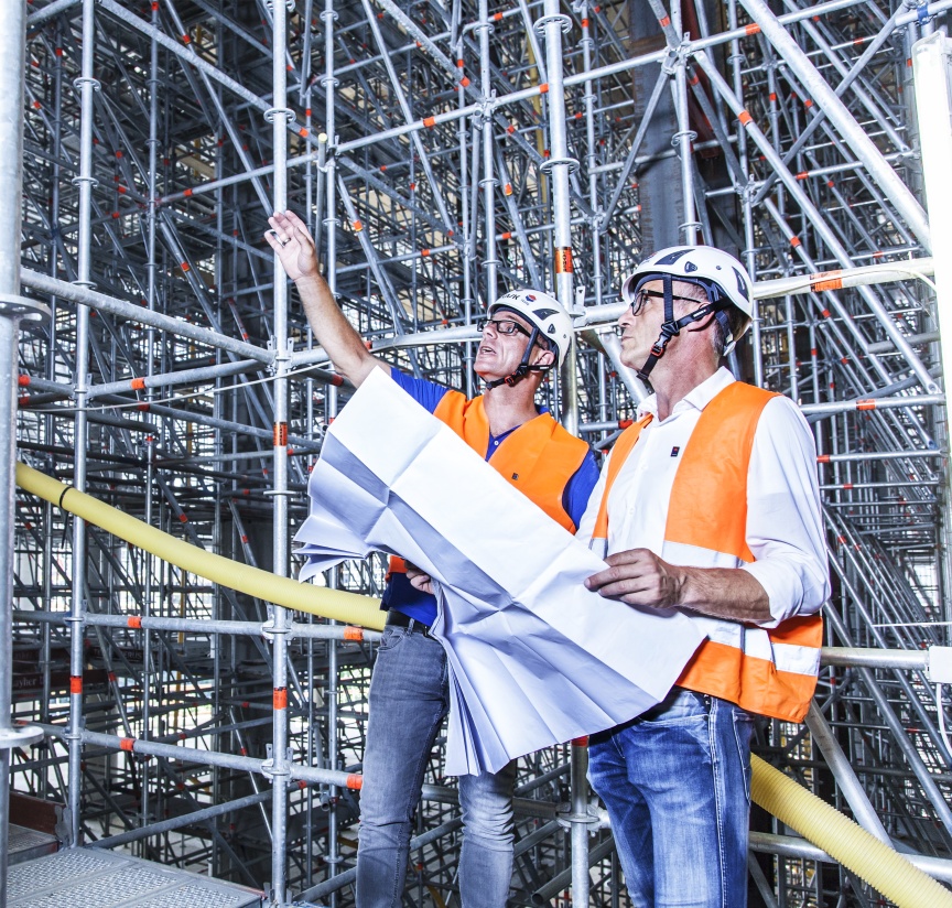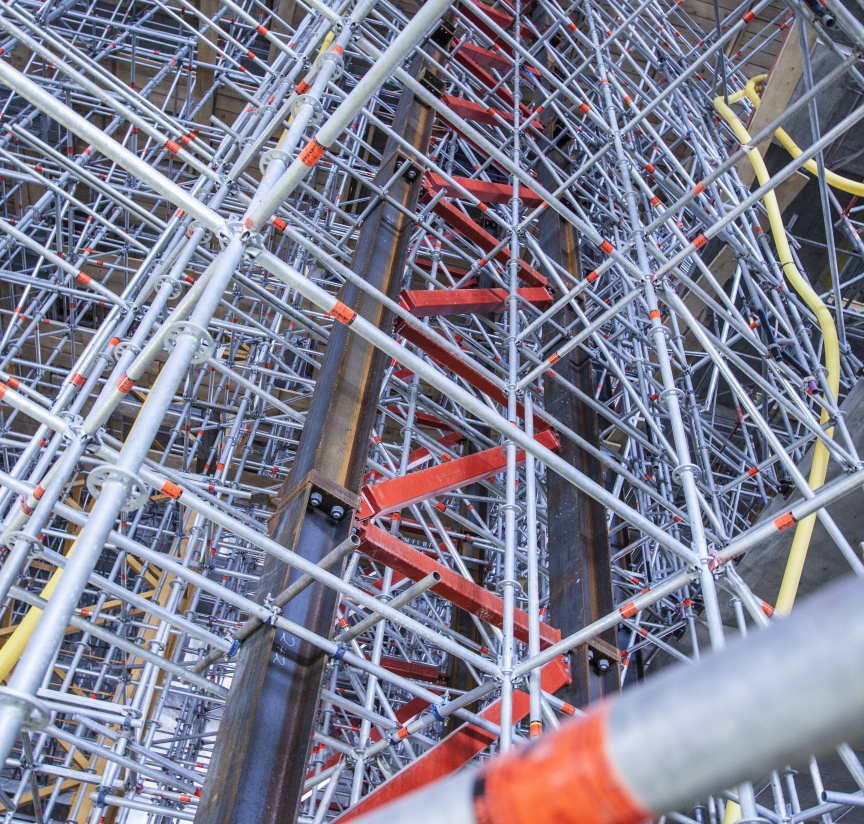 Since November 2016, when Züblin was engaged as general contractor, numerous Teupe Group statics experts and engineers have been working on this complex, large-scale project. The company did the statics for the scaffolding, all technical processing and all work scheduling itself. The modular Layher Allround System considerably simplified the scaffolding planning process. From March 2017 onwards the scaffolding specialist had up to 20 personnel permanently on site to erect the birdcage and support scaffolding, facade and safety scaffolding, stairtowers and various special-purpose structures. The high birdcage scaffolding, which is up to 40 m high in places, incorporates the Teupe heavy-duty towers and Layher Allround Scaffolding to provide a shoring structure capable of bearing loads of between 12 kN/m2 and 40 kN/m2. “The load transfer to the floor structure and the step-by-step dismantling of the birdcage scaffolding is scheduled to take place between October 2018 and April 2019. It’s going to be one of the highlights in this construction project,” said Dieter Gescher. “The statics and the logistics in this project were both major challenges, and because it wasn’t possible to store the scaffolding materials on the building site we had to get it delivered on a just-in-time basis in over 100 articulated lorries,” added Ludger Schroer.