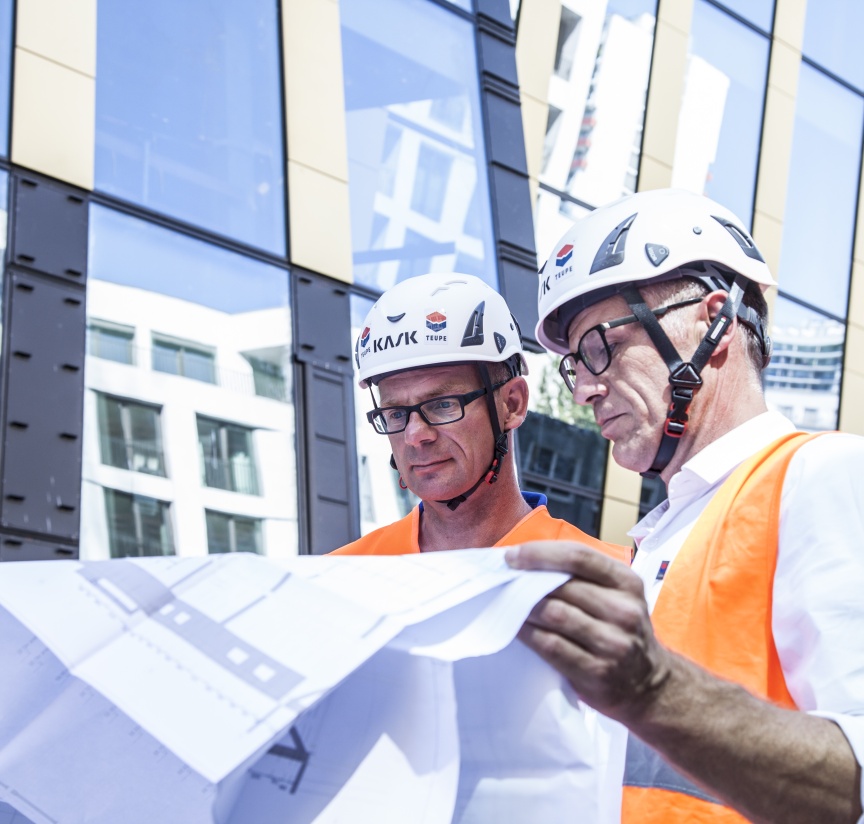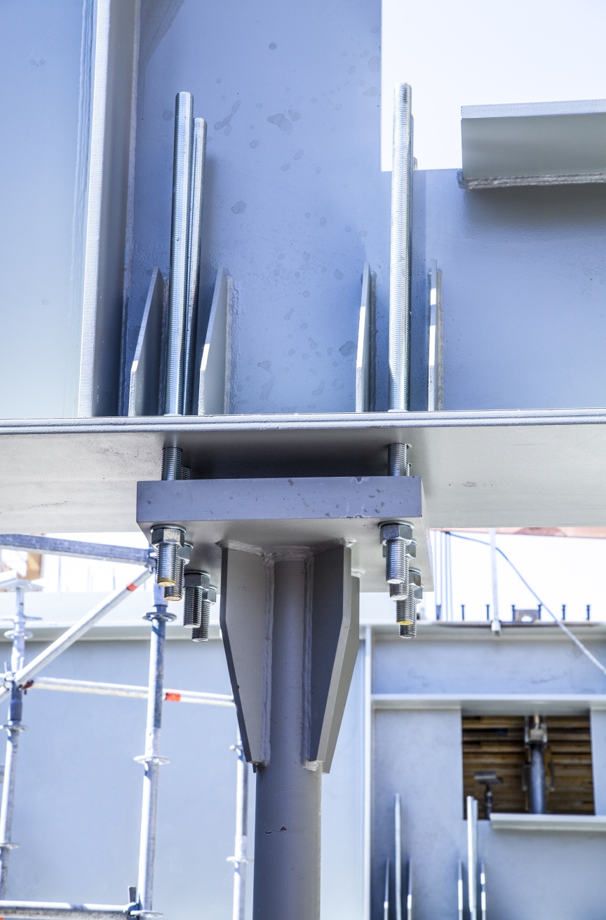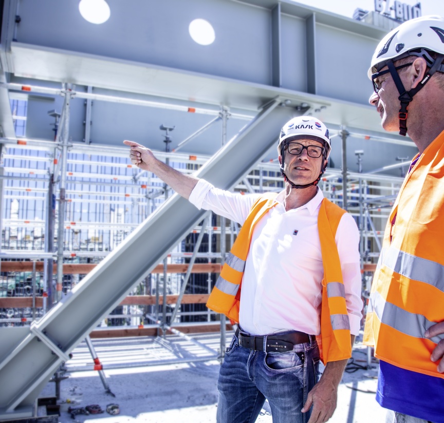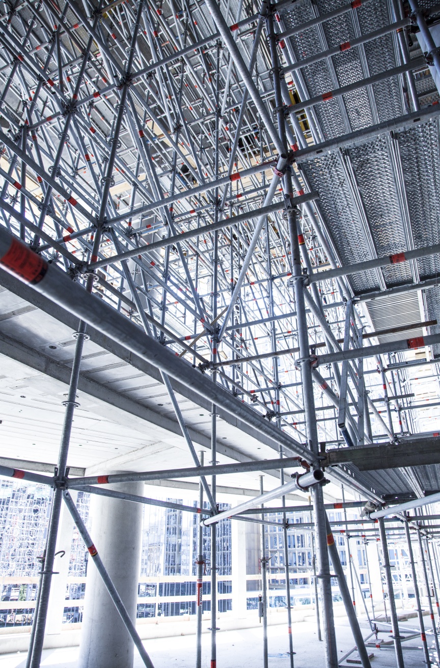 When you accompany Dieter Gescher, statics expert at Teupe & Söhne Gerüstbau GmbH, CTO of Teupe GmbH Stahl- und Maschinenbau and head of the technical office with 14 staff, through the breath-taking new Axel Springer building his enthusiasm for all the technical details of this construction project is infectious. It is designed so that the first four floors up to the atrium create the impression of a stairway, followed by a straight diagonal line back to the roof from the fifth floor upwards. In order to be able to dispense with as many supporting elements as possible, the top five floors will be hung in suspension with the help of a steel heavy-load structure, the so-called ‘transfer support structure’. During the construction phase individual loads of up to 5,200 kN are being supported by a combination of standard Allround Scaffolding components and Teupe heavy-duty towers. “Here in the atrium we’ve got a birdcage structure composed of 125,000 m3 of Layher Allround Scaffolding and 1,200 t Teupe heavy-duty towers to cope with these enormous loads,” said Ludger Schroer, Teupe’s Senior Site Supervisor. “Layher’s material and ‘more possibilities’ concept ideally equips us for our projects,” explained Dieter Gescher.