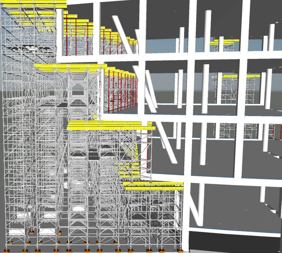 Ein wichtiger Erfolgsfaktor war die digitale Vorplanung des Traggerüsts in 3D – direkt im 3D-Gebäudemodell des Bauwerks. Dies ermöglichte im Vorfeld eine enge Abstimmung zwischen den Layher Anwendungsingenieuren und den Spezialisten von Dreßler Bau: die Grundlage für eine schnelle und reibungslose Traggerüstmontage.