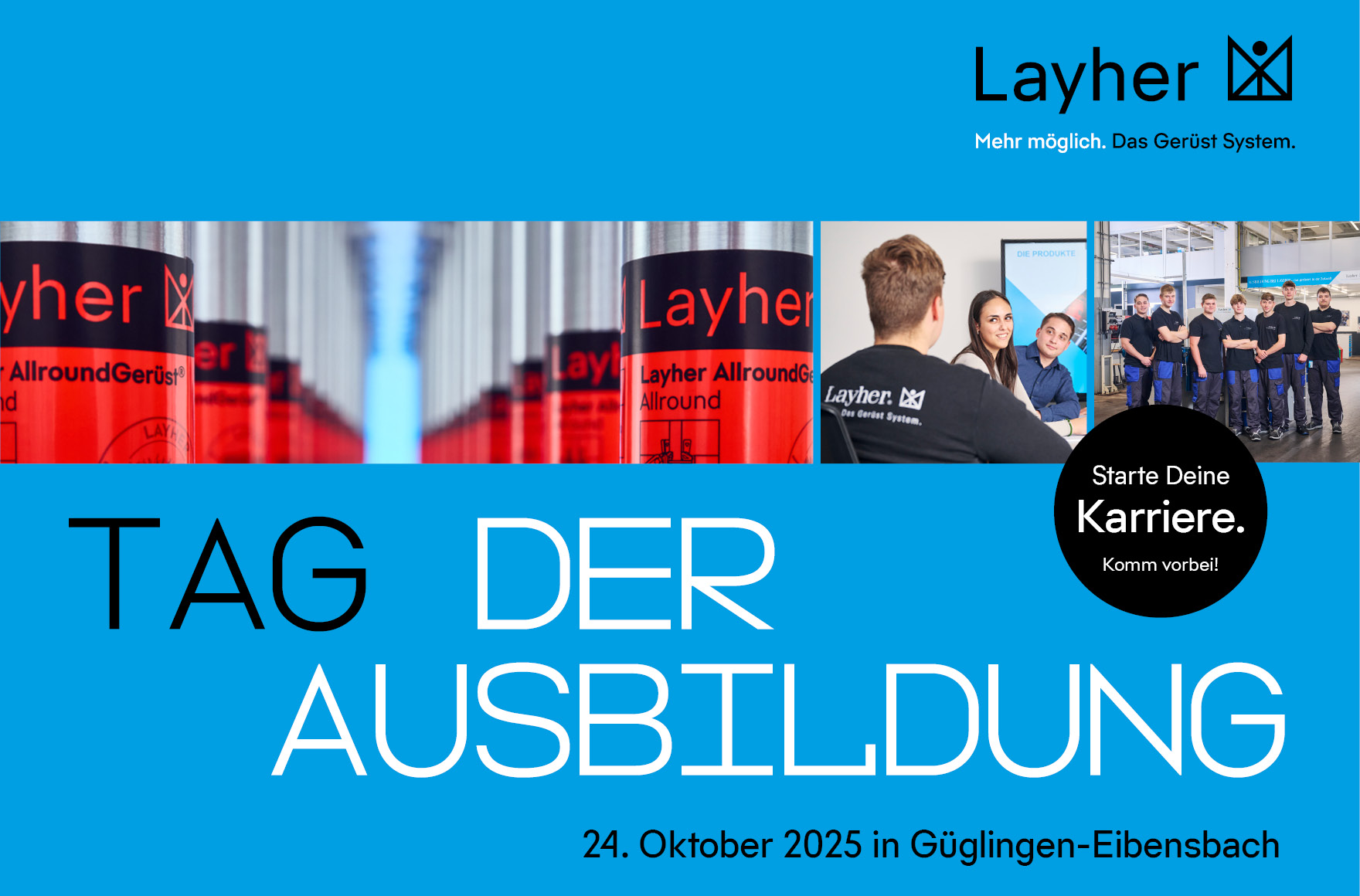 GÜGLINGEN-EIBENSBACH. Im Rahmen der Veranstaltung „Tag der Ausbildung“ am 24. Oktober 2025 haben junge Menschen die Möglichkeit, bei Layher verschiedene Ausbildungsberufe im gewerblichen, technischen und kaufmännischen Bereich in kompakter Form „praktisch“ zu erleben. Von 16 bis 19 Uhr erwartet die Schülerinnen und Schüler ein abwechslungsreiches Programm mit Vorträgen zur Ausbildung bei Layher, Einblicken in verschiedene Berufsbilder und Tipps für die Bewerbung. Aktuelle Auszubildende berichten aus ihrem Alltag. Und die angehenden Nachwuchskräfte können ihre künftigen Ausbilderinnen und Ausbilder persönlich kennenlernen.