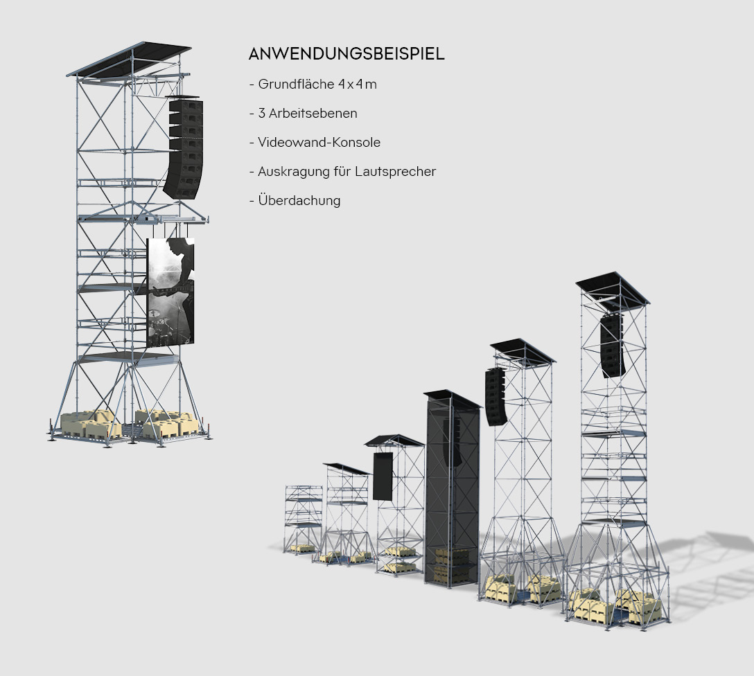 Die Anwendungsvielfalt reicht von klassischen Lautsprechertürmen über Kamera- und Regietürme bis hin zu Beleuchtungs- oder Werbetürmen.