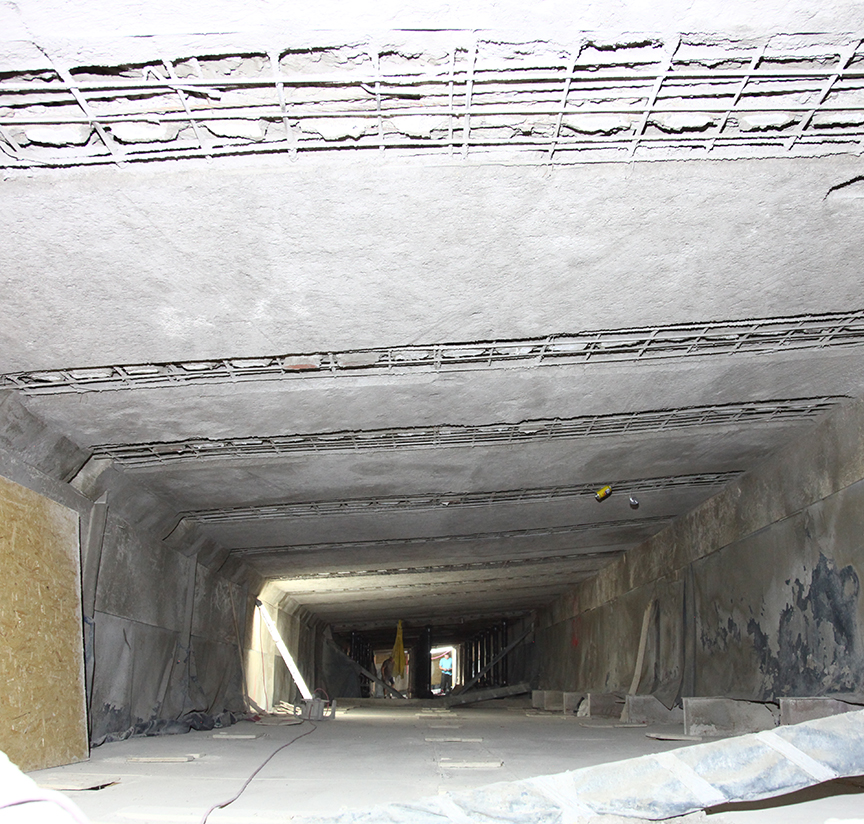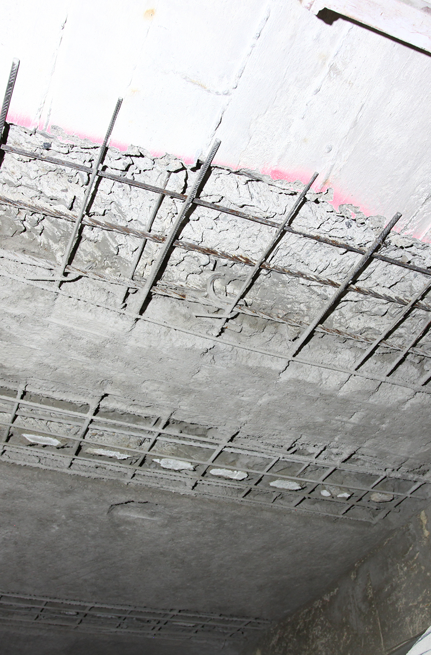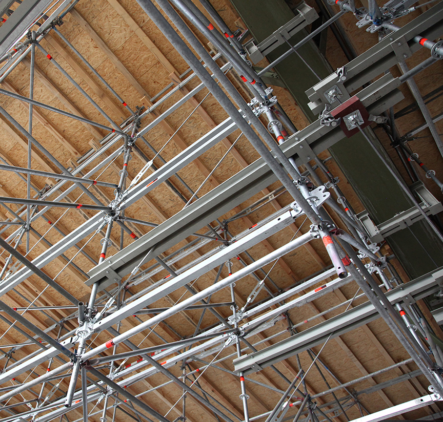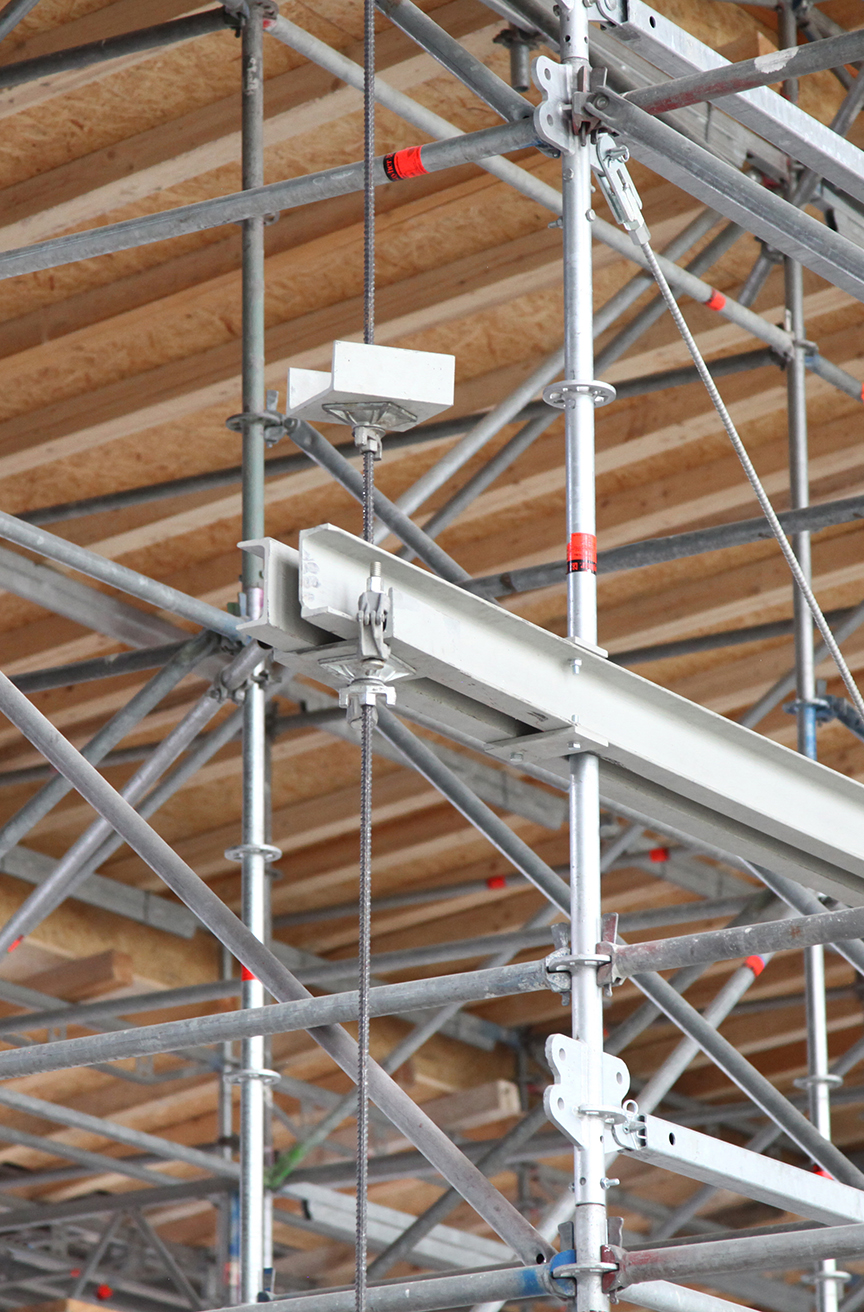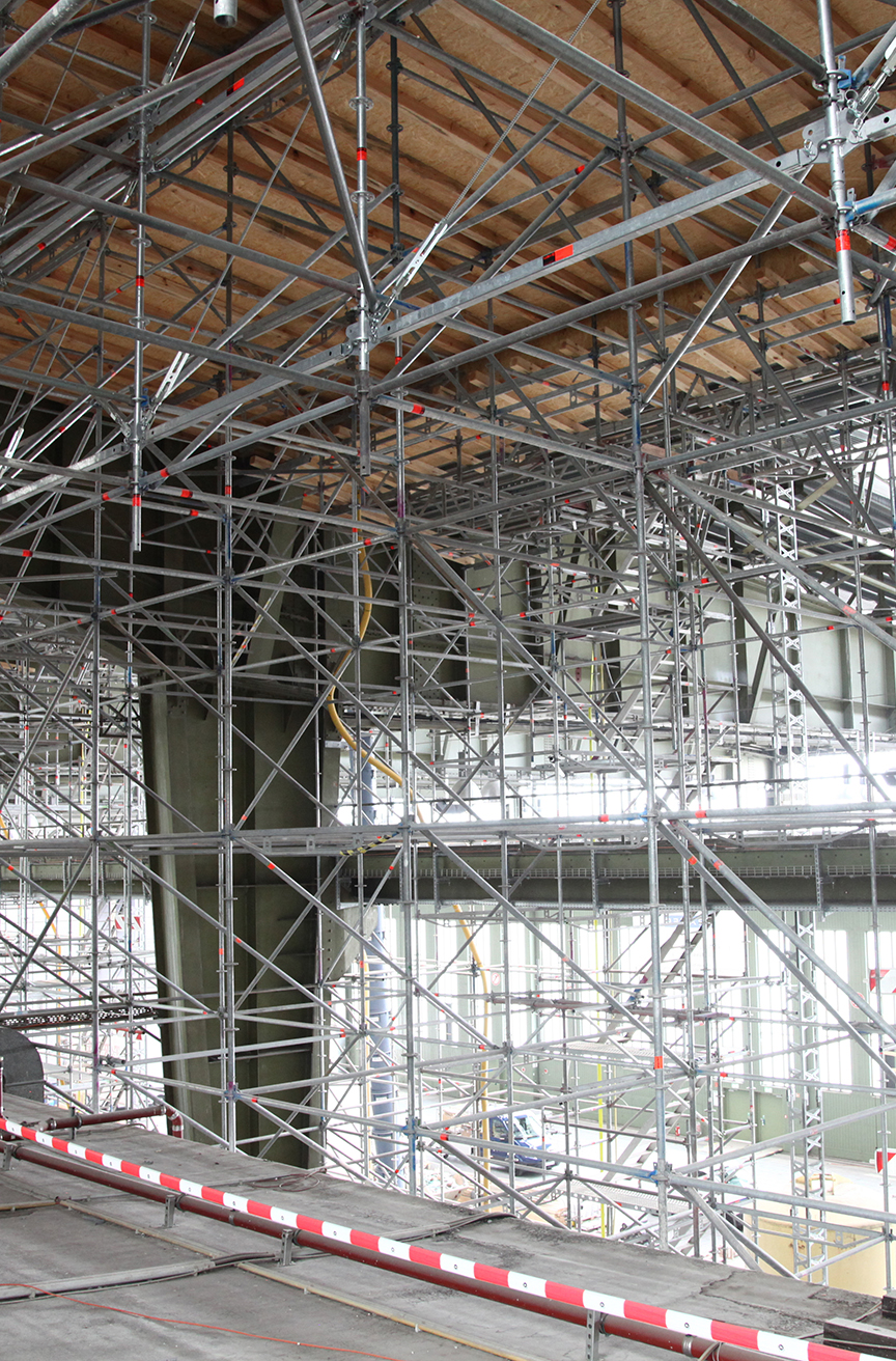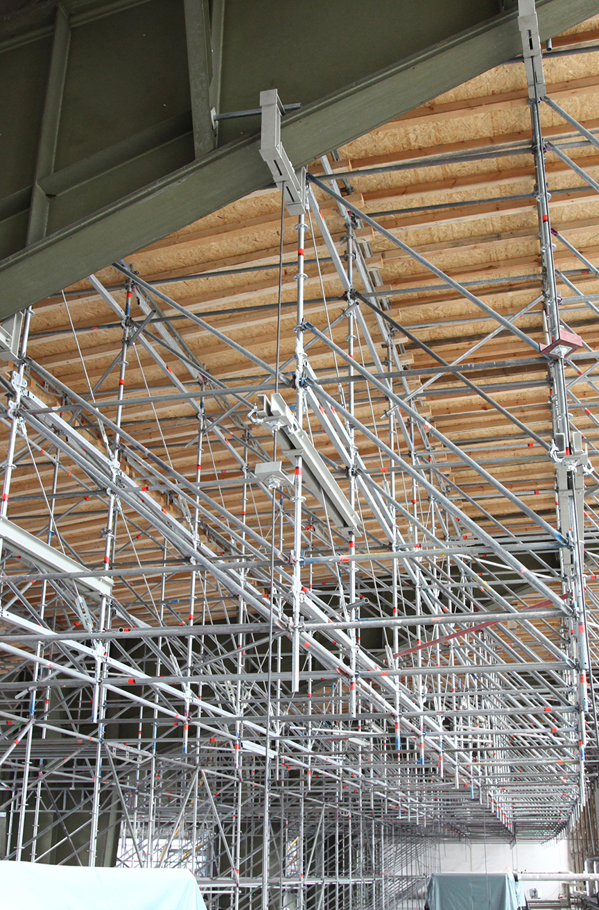 Um die 18 m Abstand zwischen den Hallensäulen überspannen zu können, verwenden die Gerüstbauer der Tisch GmbH die Allround Fachwerkträger von Layher. „Wir montieren die Fachwerkträger peu à peu vom Arbeitsgerüst aus, um die gesamte Stecke zu überspannen“, geht Nick Haseloff ins Detail. Um die Sandstrahl- und Betonarbeiten durchführen zu können, wird auf das hängende Grundgerüst aus OSB-Platten und Spezial-Folie eine wasserdichte, abgeschlossene Arbeitsplattform gebaut, damit das abgetragene Material samt Wasser ablaufen kann. „Der hochtragfähige Allround Fachwerkträger muss das enorme Gewicht der Konstruktion von 28 t über die gesamte Spannweite tragen und zuverlässig an die Dachbinder überleiten. Was von unten so einfach aussieht, hat seine Tücken im Detail“, so Dénes Frömling, Gebietsverkaufsleiter von Layher für Berlin. Die gesamte Konstruktion wurde zudem mit den Stahl- bzw. Aluträgern zusätzlich versteift, um zu verhindern, dass das Gerüst in Schwingung gerät.