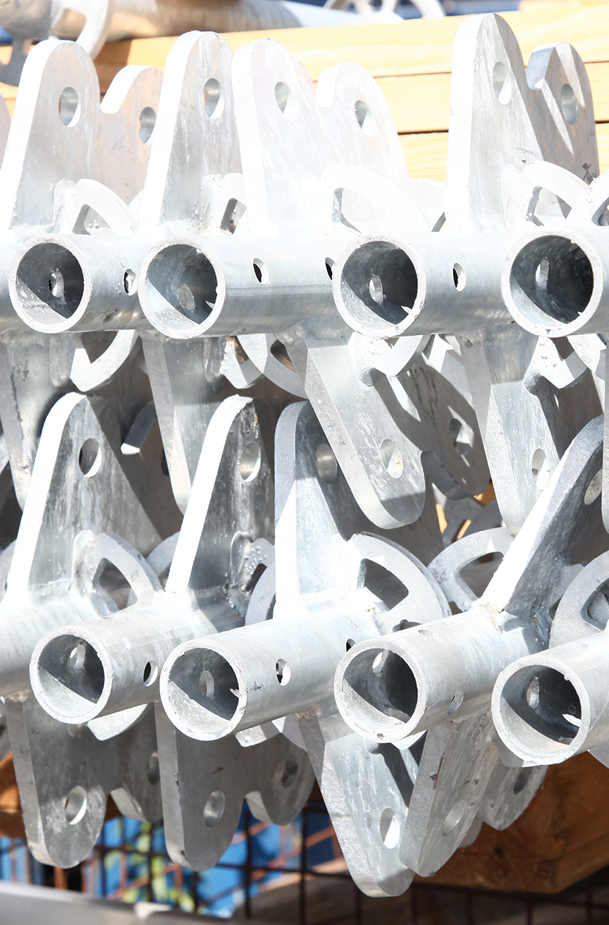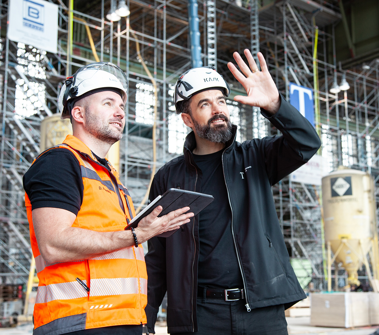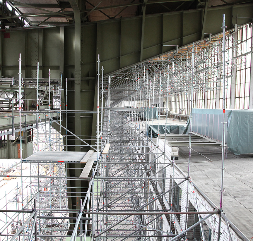 „Vor den hinten liegenden Servicegebäuden haben die Gerüstbauspezialisten von Tisch aus Layher AllroundGerüst ein Raumgerüst erbaut, das den Zugang zu den eigentlichen Arbeitsplattformen ermöglicht und zudem als Basis für die vier Lastenaufzüge in der Halle dient“, erklärt Dénes Frömling. Durch die einheitlichen Systemmaße sind die Fachwerkträger vollständig in den Allround Baukasten integriert, sodass der Anschluss an das AllroundGerüst problemlos funktioniert. Die rund 58.000 m3 Gerüst werden hier während der Sanierungsarbeiten immer wieder alternierend auf- und abgebaut. So wurden bereits einige Hallen mit jeweils ca. 10.000 m3 Gerüst saniert und die weiteren werden folgen. „Wir sind hier mit durchschnittlich 12 Mitarbeitern schon seit 1,5 Jahren aktiv und werden bis zum Abschluss der Arbeiten bestimmt noch weitere zwei Jahre beschäftigt sein“, so Nick Haseloff.