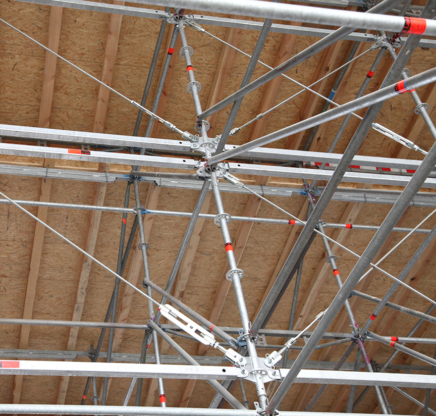 „Das Besondere an diesem Projekt ist die Tatsache, dass wir das Arbeitsgerüst nicht auf den Bürobauwerken im hinteren Teil der Hallen ablasten können, da diese nur einfache Holzdächer ohne Tragfähigkeit haben und auch die Wände nicht zusätzlich belastet werden dürfen. Daher müssen wir unsere kompletten Arbeitsgerüste an den Dachbindern abhängen“, erklärt Geschäftsführer Nick Haseloff, der als Architekt auch die Statik des Aufbaus im Blick hat.