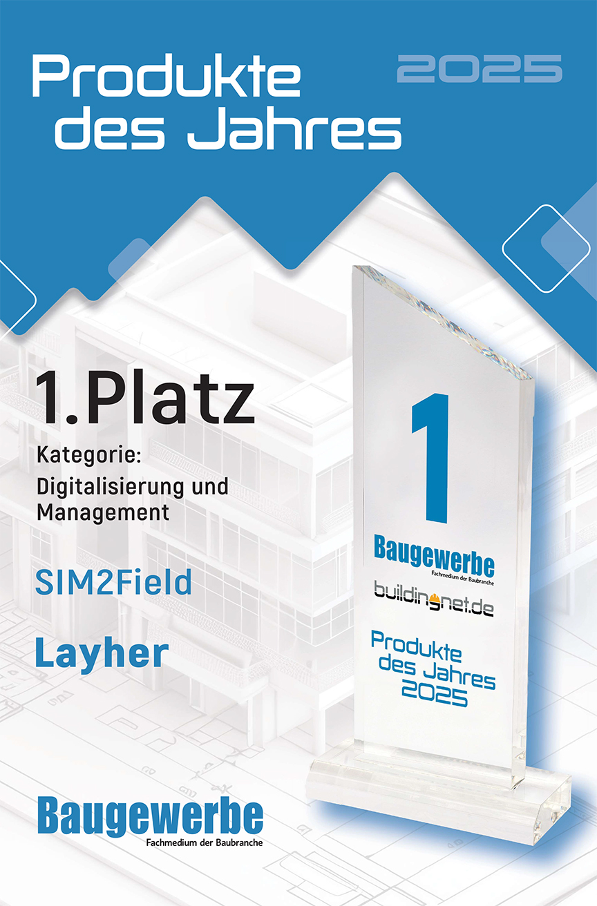 GÜGLINGEN-EIBENSBACH. Beim Innovationspreis „Produkt des Jahres“ wurde der neue digitale Service SIM2Field von Layher in der Kategorie „Digitalisierung und Management“ als Sieger ausgezeichnet. SIM2Field ermöglicht das Einmessen von Gerüstkonstruktionen mittels Totalstation auf Basis des 3D-Gerüstmodells. Im Vergleich zum konventionellen Einmessen ist SIM2Field schneller und präziser. Dies erhöht die Baustelleneffizienz.