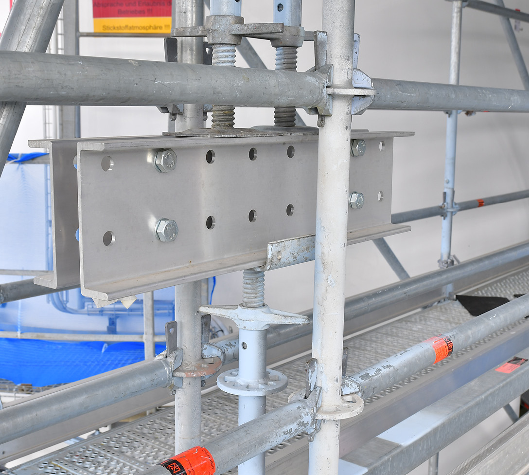 Die dafür notwendigen doppelten Allround-Stiele wurden auf dem Aluminium-Träger TwixBeam aufgestellt und die Lasten so in die einzelnen Allround-Stiele des Arbeitsgerüsts eingeleitet.