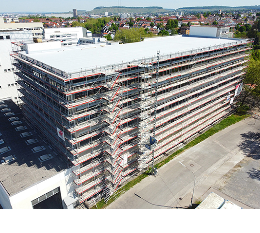 Für Umbau und Kernsanierung eines Fabrikgebäudes war ein rund 5.000 Quadratmeter großes Arbeitsgerüst der Lastklasse 3 mit verschiedenen Zusatzaufgabenstellungen nötig. Mit dem modularen Fassadengerüst AGS konnte das Gerüstbauunternehmen H + P das Fassadengerüst optimal an die Gebäudegeometrie anpassen und alle Anforderungen wirtschaftlich realisieren. Sicherheit inklusive.