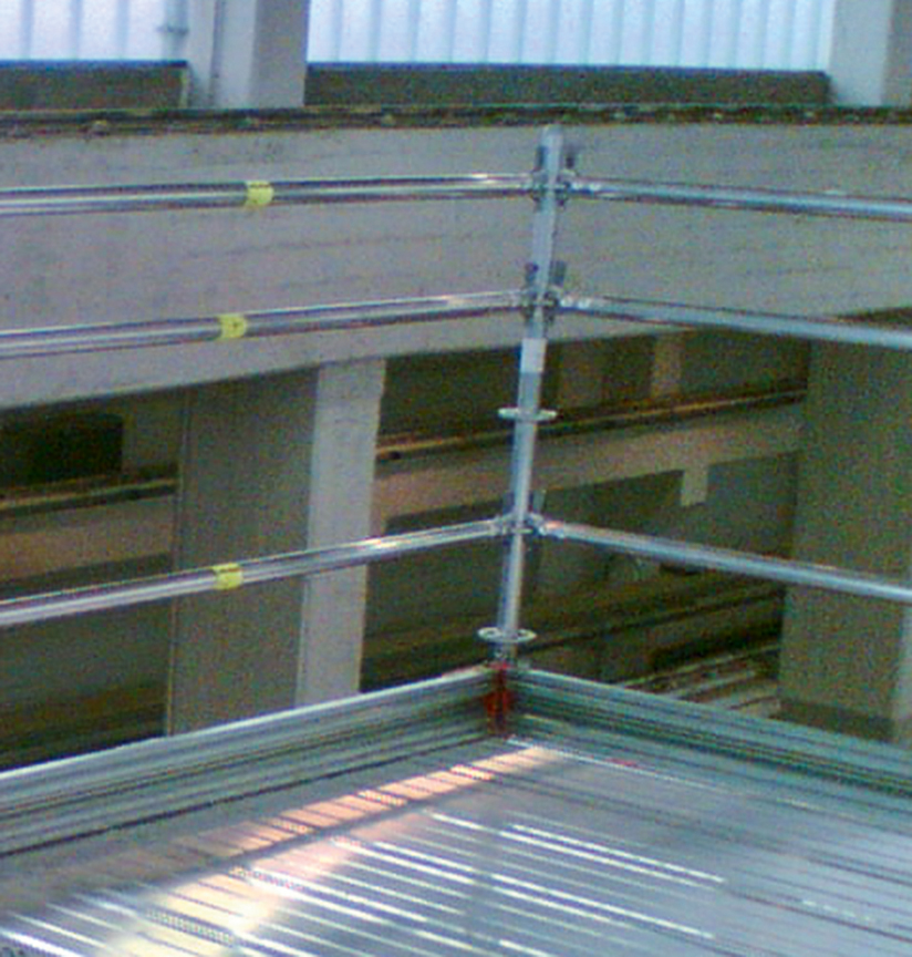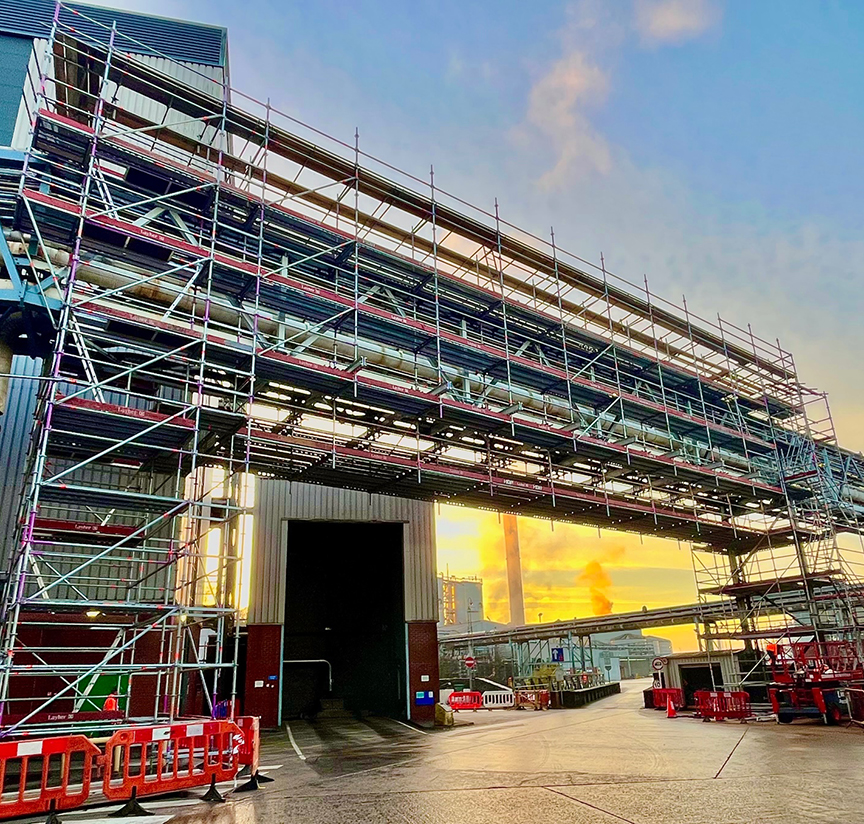 Um die Brandlast, z. B. bei Schweißarbeiten, zu reduzieren, kann mit Layher Gerüstsystemen vollständig auf Holz verzichtet werden.