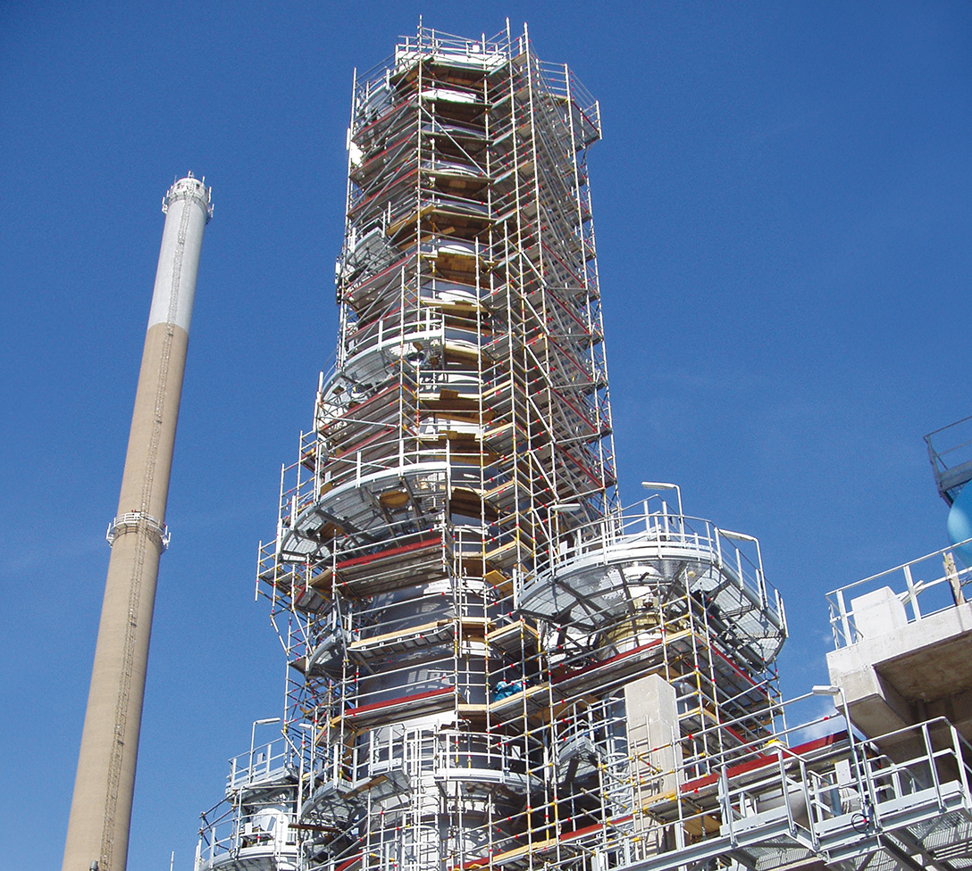 Einrüstung von Schornsteinen und Kolonnen zur Wartung, Reparaturen oder Inspektionen. Aufgrund der Höhe der Anlage und des Zugangs in großen Höhen spielen Sicherheit, Flexibilität und Effizienz eine wichtige Rolle. Bei Layher sind diese Faktoren kein Wiederspruch.