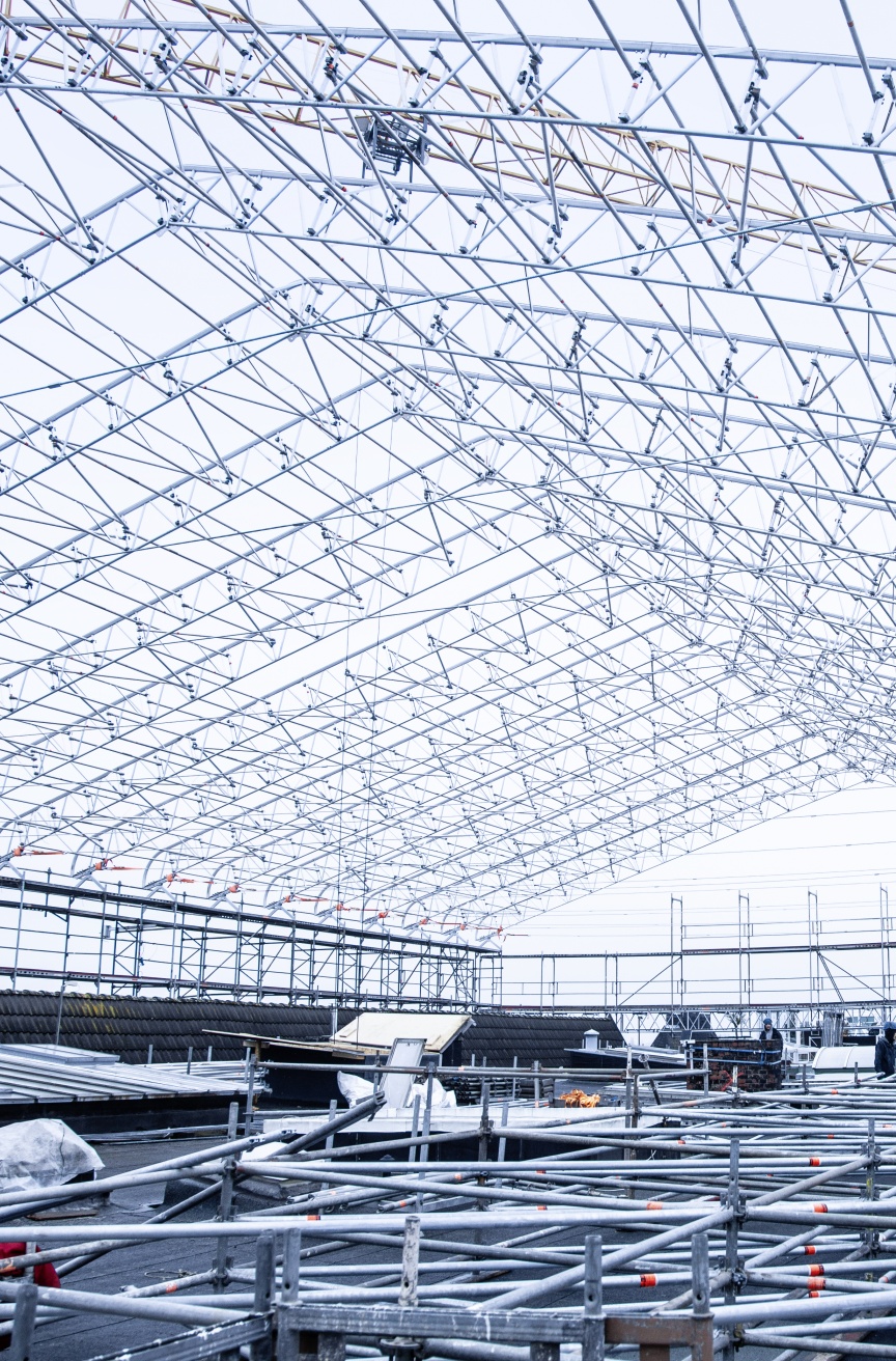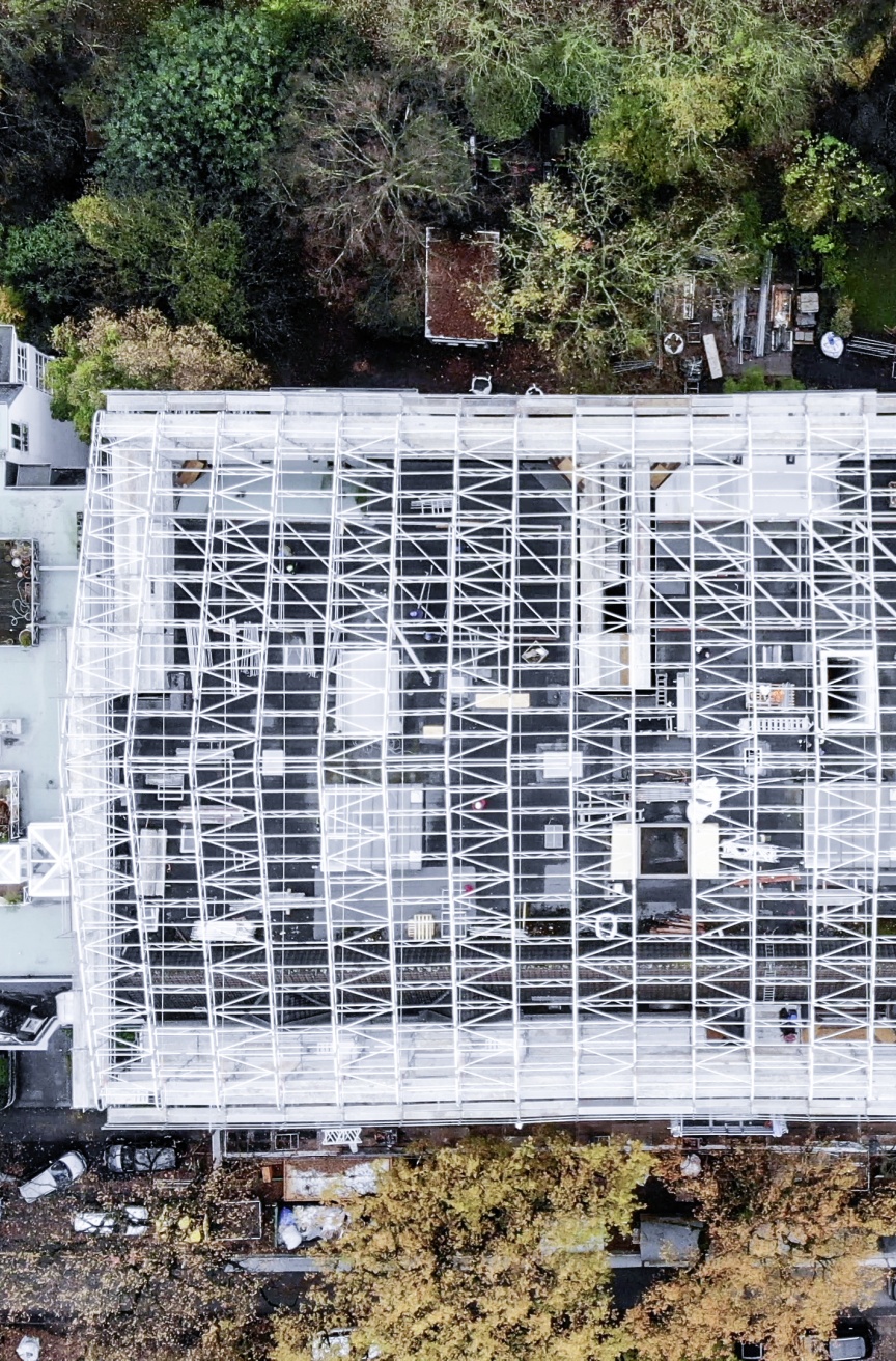 Für die Baustelle wurde von den Hamburger Gerüstbau-Spezialisten insgesamt ca. 7.400 m2 Layher Gerüst aufgebaut. Bei der Aufstockung des Gebäudes muss zuerst das bestehende Dach rückgebaut werden, was auch für das Fassadengerüst aus Layher Blitz Gerüst immense Auswirkungen hat, da an den oberen drei Geschossen dadurch nicht in der Fassade verankert werden konnte. „Wir mussten einige zusätzliche Statikschleifen drehen, da auf dem Blitz Gerüst auch das gesamte Kederdach XL aufliegt und wir die oberen Lagen zusätzlich vertikal versteifen mussten. Das war eine ziemliche Materialschlacht“, so der erfahrene Gerüstbauer Stefan Grasnick. „Wir haben am Blitz Gerüst zusätzlich allein 1.330 laufende Meter Gitterträger horizontal und vertikal verbaut, um das Ganze auch statisch sicherzumachen.“ Um die Gerüstkonstruktion für die besonderen Herausforderungen zusätzlich zu ertüchtigen, wurden in die Dachkonstruktion drei, jeweils über 2,3 t schwere „Gerüsttische“ eingehängt. „Das Statikbüro hat hier wirklich ganz besondere Arbeit geleistet“, zeigt sich auch René Stender, Layher Gebietsverkaufsleiter in Hamburg sichtlich beeindruckt. „Diese Zusatzkonstruktionen helfen, das gesamte Gerüst und das über 2.000 m2 große Kederdach XL für die hohen Anforderungen auszubilden, die Wind und Wetter mit sich bringen.“