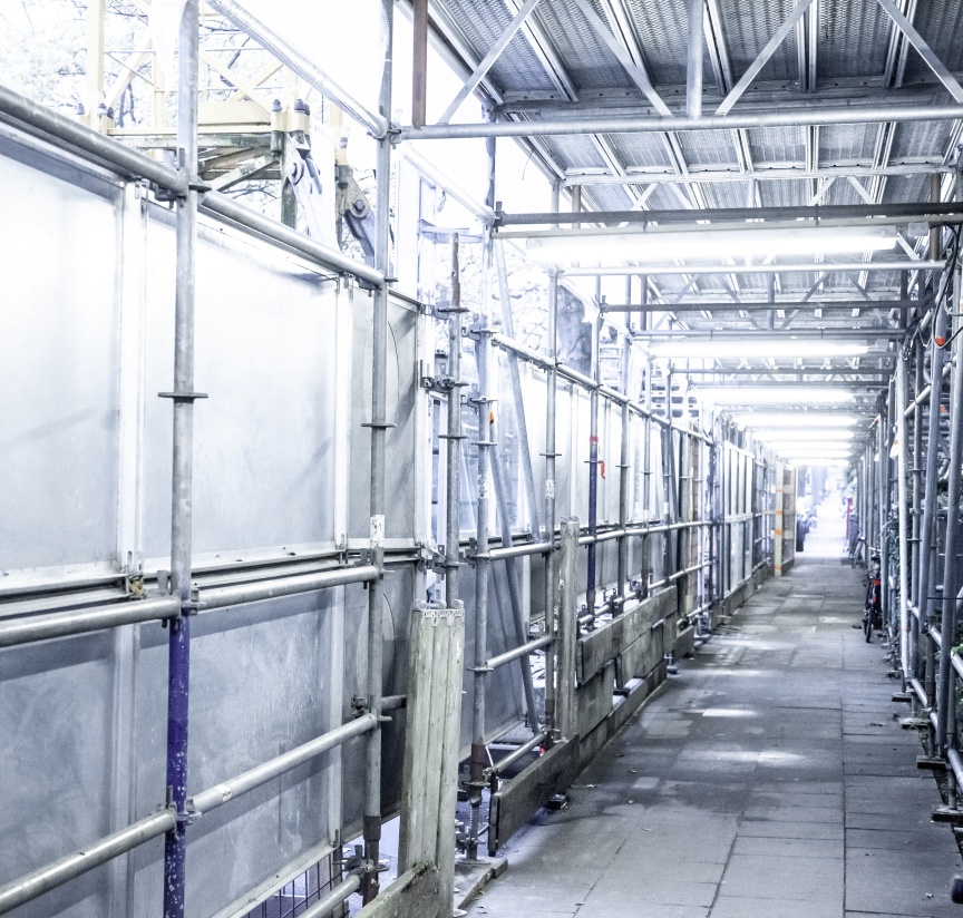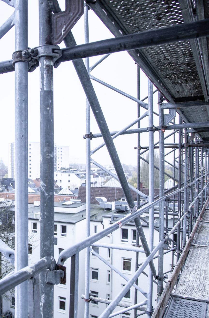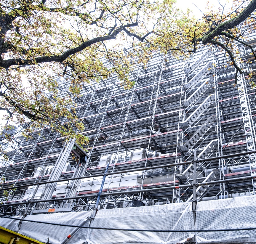 „Wir brauchen ein Fassadengerüst und Kederdach für eine Gebäudeaufstockung. Was sich als Arbeitsauftrag am Telefon erst einmal banal anhörte, wurde in der Planung und Realisierung von Tag zu Tag größer und kniffliger“, erläutert Christopher Busch, Geschäftsführer des gleichnamigen Gerüstbauunternehmens aus Hamburg. Die Sierichstraße ist eine der meistbefahrenen Straßen in Hamburg, die im Bereich der Fassade für Kran und Baustellenausstattung auf eine Fahrspur verschmälert werden musste. Um nicht mehr öffentlichen Raum zu belegen als zwingend notwendig, wurde der Gehweg mit Layher AllroundGerüst und Protect-System Elementen zu einem überdachten Passanten-Tunnel. Darüber und über dem gesamten Vorgarten entstand eine 70 m breite und bis zu 6 m tiefe Plattform. „Wer hier einmal in der Rushhour vorbeigekommen ist, weiß, dass jeder Zentimeter Straße benötigt wird. Daher haben wir den Vorgarten komplett überbaut. So können die benötigten Baumaterialien während den 1,5 Jahren Bauzeit einfach zwischengelagert und die Beeinträchtigungen des Verkehrs auf ein Minimum reduziert werden“, so Stefan Grasnick, verantwortlicher Bauleiter des Projekts.