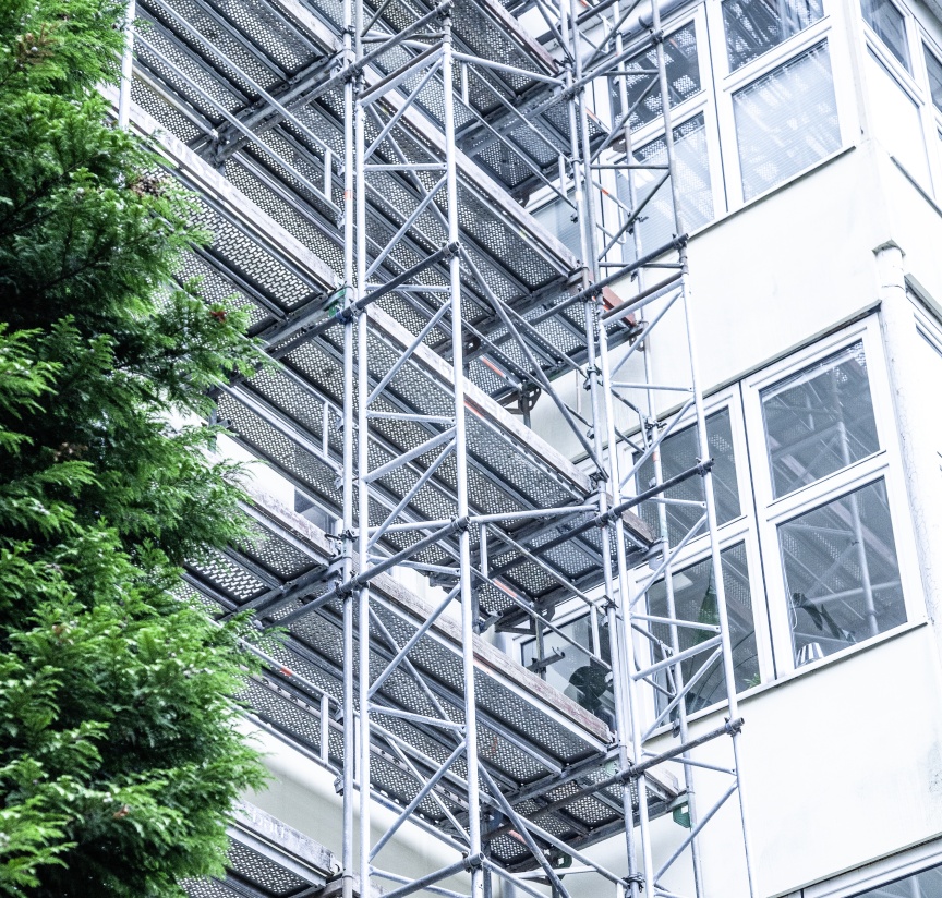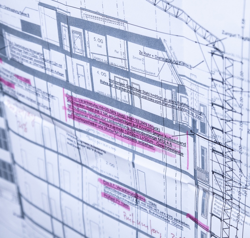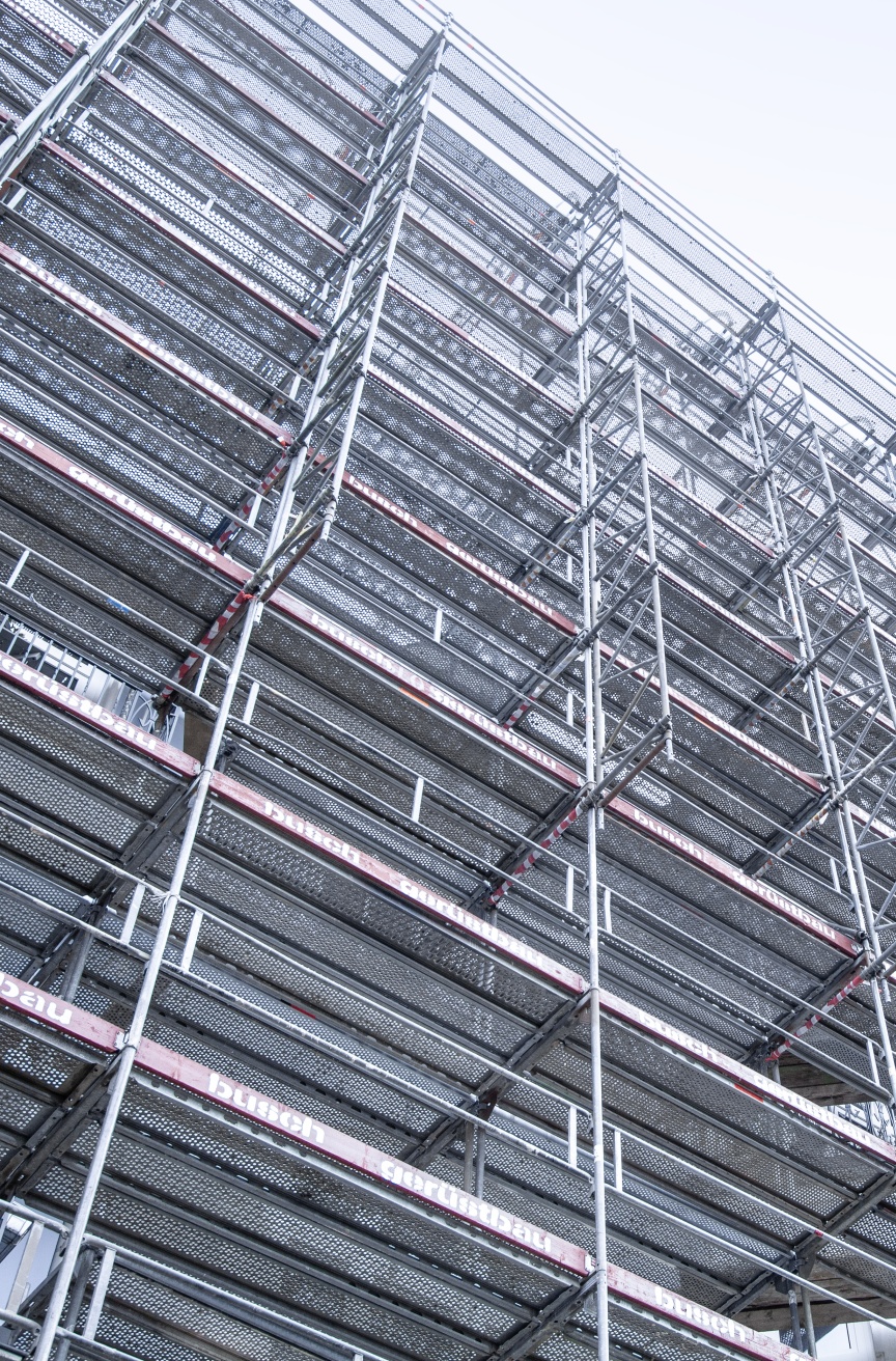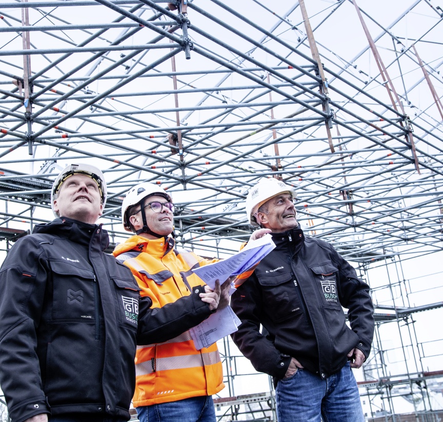 „So ein Projekt braucht Teamwork – und da meine ich nicht nur unsere Mitarbeiter in der Kolonne oder im Büro. Auch die Zusammenarbeit mit unserem Kunden, den anderen Gewerken, dem Statikbüro und nicht zuletzt mit Layher ist elementar für unsere erfolgreiche Arbeit“, führt Christopher Busch aus. Bei diesem Projekt spielte die enge Zusammenarbeit mit dem Statikbüro und dem regionalen Layher Ansprechpartner eine besondere Rolle, da sich die Anforderungen immer wieder verändert haben und so zeitnah neue Berechnungen und viel neues Material für die Baustelle benötigt wurde. „Hier zeigen sich die Vorteile eines guten Netzwerks, in dem alle am selben Strang ziehen, um Projekte gemeinsam professionell realisieren zu können“, zeigt sich Christopher Busch zufrieden. „Ganz aktuell haben wir eine Mitarbeiterin direkt bei Layher auf die LayPLAN CAD Software schulen lassen, um in Zukunft unsere Projekte noch effizienter planen und dann auch realisieren zu können“, ergänzt Bauleiter Grasnick. Die Möglichkeiten, die sich daraus ergeben, eine Gerüstplanung schon im Vorfeld am Computer detailliert zu sehen, sind immens. So können nicht nur das benötigte Material, die Logistik und die Aufbauschritte sehr genau geplant werden, auch architektonische oder statische Herausforderungen kann man frühzeitig erkennen und schon am Computer Lösungen erarbeiten. „Gerüstbau wird zunehmend digital – und wir sind vorne mit dabei und nutzen die Vorteile konsequent aus“, schließen die beiden Profis nicht ohne Stolz.