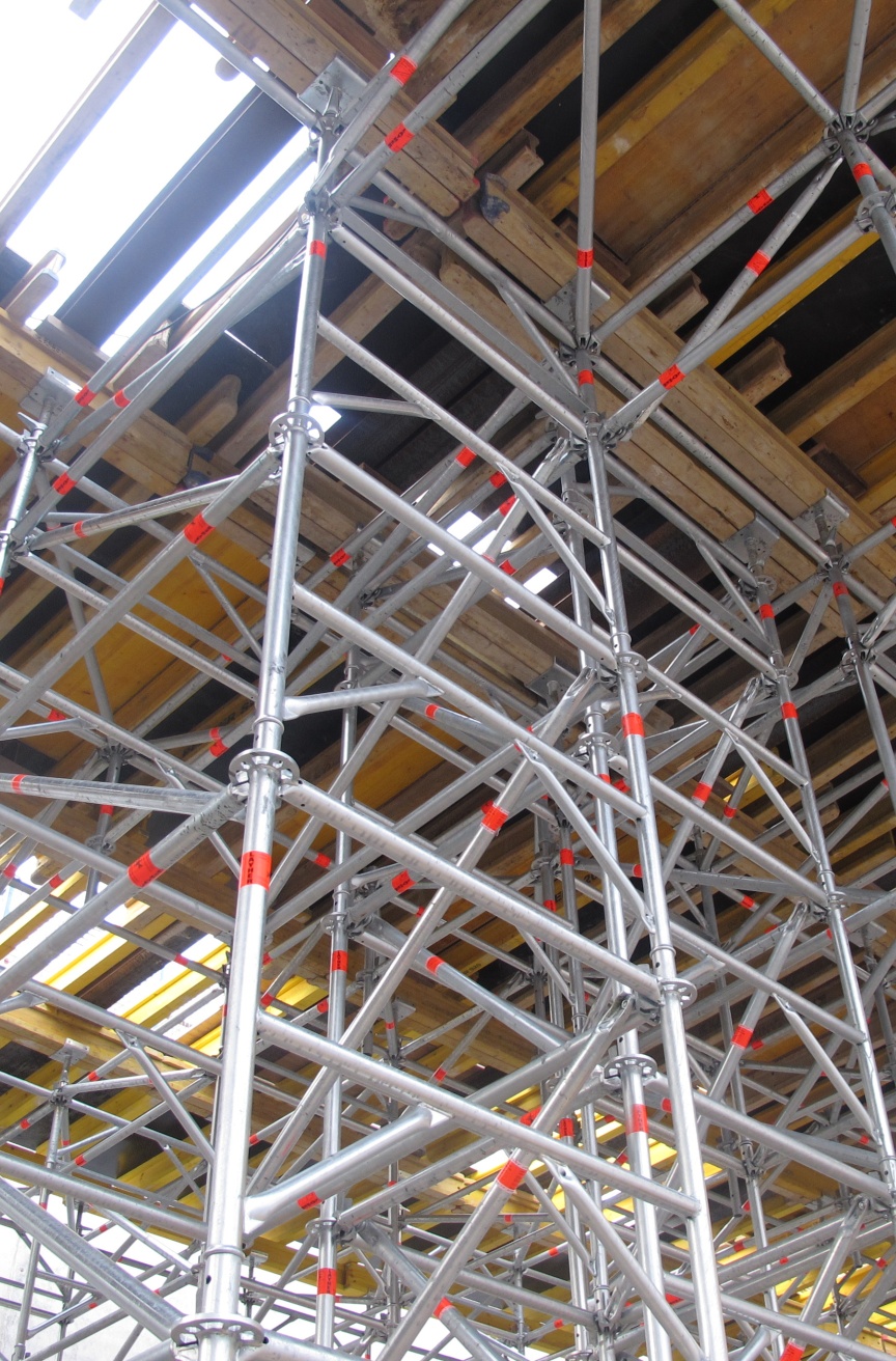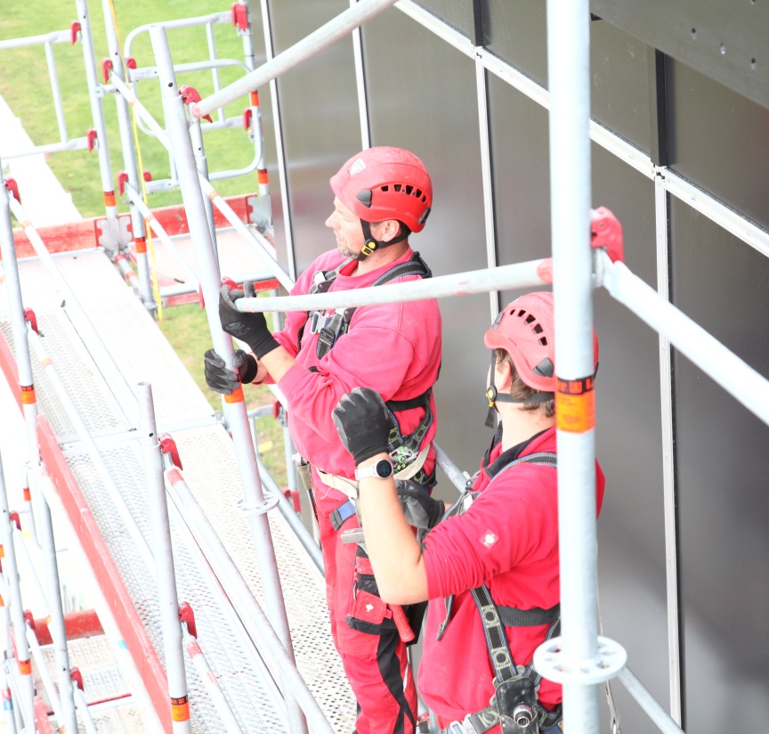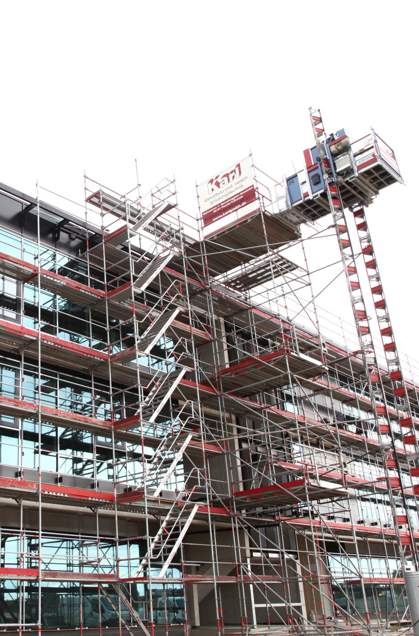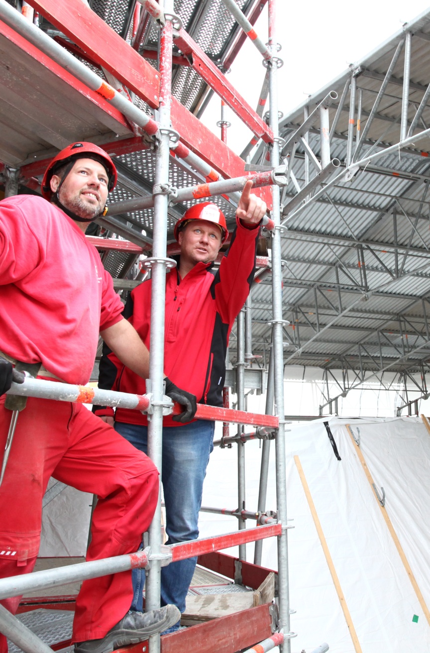 Das Unternehmen war eines der ersten, das die Allround STAR Rahmen, das Allround Traggerüst TG 60, den Allround Brückenträger und das innovative modulare Fassadengerüstsystem AGS mit systemintegriertem voreilenden Seitenschutz in der Praxis eingesetzt hat. „Wir sind getrieben von dem Anspruch, uns immer weiter zu verbessern, um nachhaltig erfolgreich zu sein. Die innovativen Lösungen und Ausbauteile von Layher helfen uns dabei. Daher sind wir immer an den Neuheiten interessiert und testen alle Ideen aus Eibensbach auf unseren Baustellen. Und ich muss sagen, wir sind jedes Mal überrascht, wie man sogar die bestehenden Produkte immer noch ein bisschen besser machen kann“, führt Kevin Fleischmann, Gerüstbaumeister und Bauleiter des Unternehmens aus.