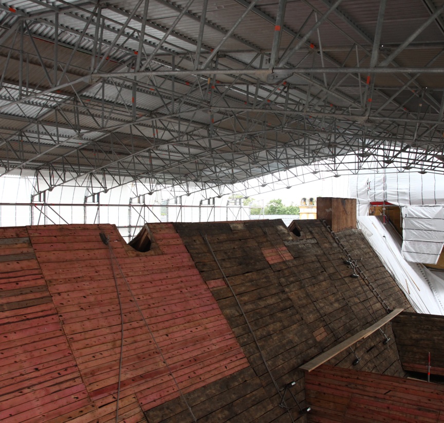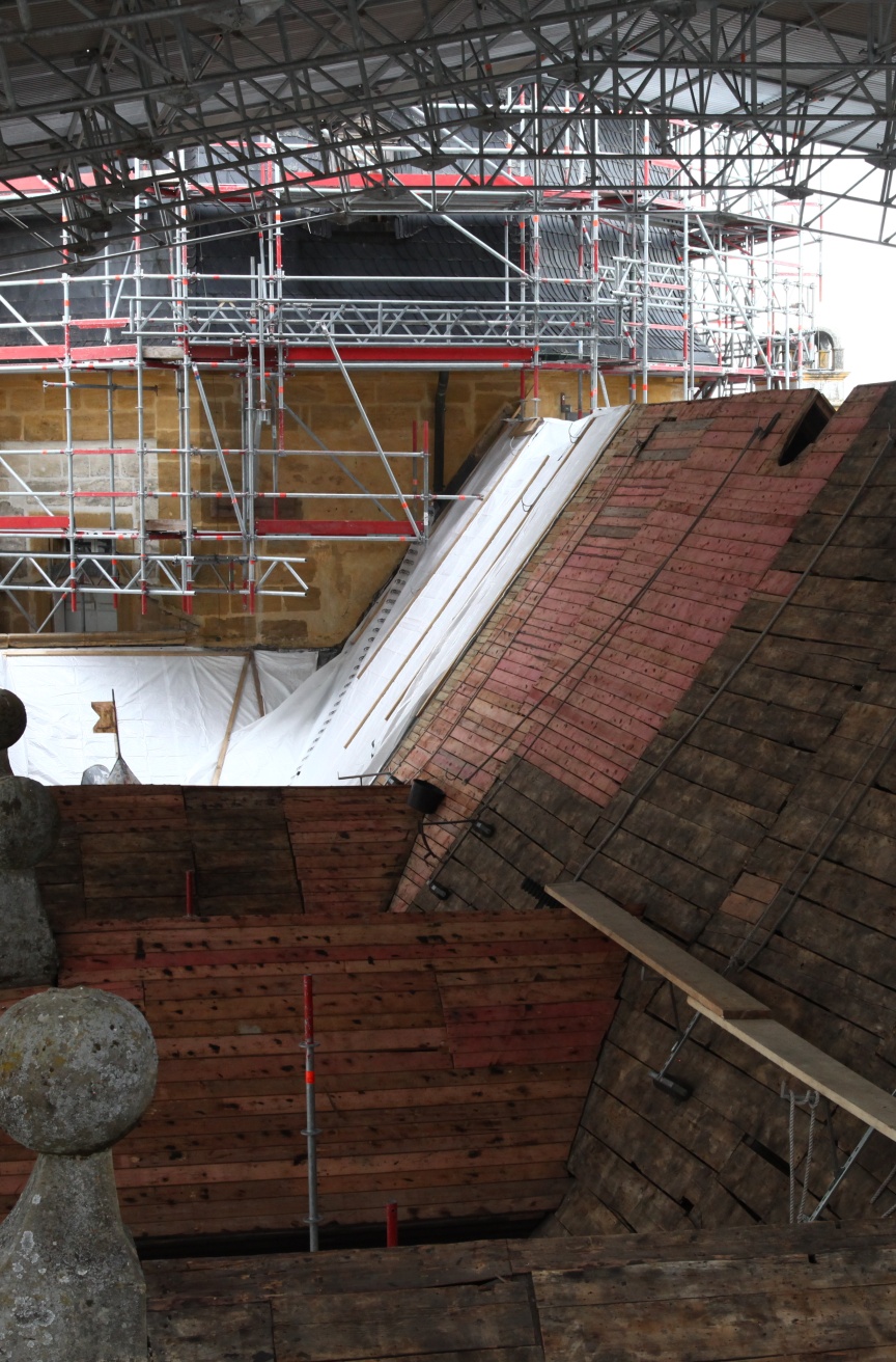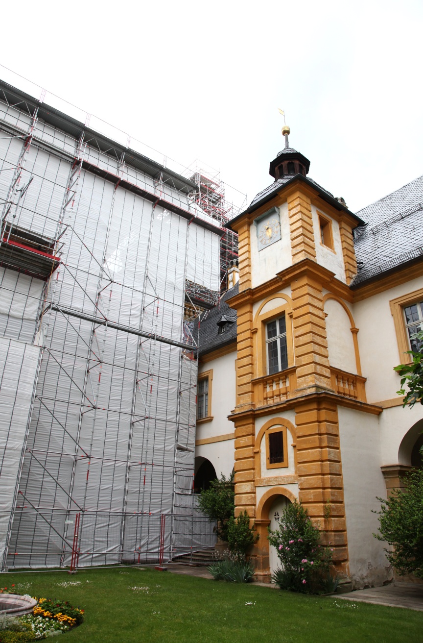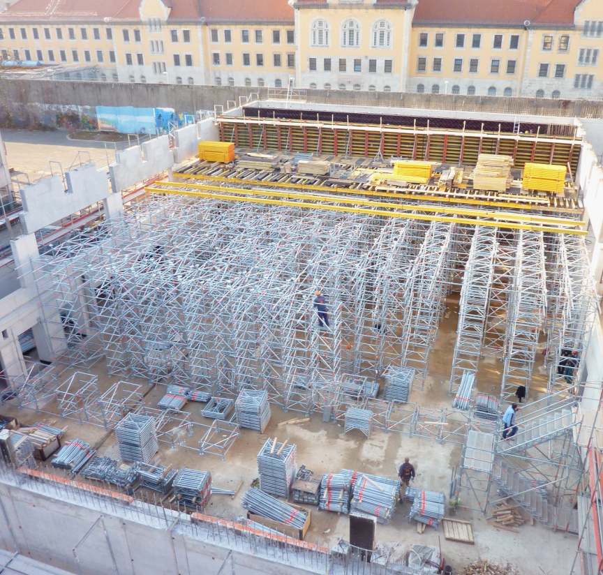 „Aktuell haben wir einige spannende Baustellen hier in Bamberg und in der Umgebung, die unsere Bandbreite und die Einsatzmöglichkeiten der Layher Gerüstsysteme gut zeigen“, erzählt der Praktiker Fleischmann, der täglich auf den Baustellen unterwegs ist. Am Bamberger Dom haben die Gerüstbauer für die Dombauhütte an einem angehängten Gerüst die beiden Türme mit schwimmend gelagerten Allround Brückenträgern verbunden, um den Baustellenzugang bei der Sanierung des Bauwerks zu vereinfachen und dabei auch noch signifikant Gerüstmaterial einzusparen. In Sichtweite des historischen Baus entsteht die Firmenzentrale eines regionalen Unternehmens, für dessen Fassadengerüst die Experten erstmals das AGS System von Layher einsetzten. Das modulare Fassadengerüstsystem AGS verbindet den systemintegrierten Seitenschutz gemäß TRBS 2121-1 mit der Flexibilität und Anwendungsvielfalt des modularen Allround-Systems. Aktuelle Sicherheitsvorschriften lassen sich damit wirtschaftlich umsetzten. Beim Gebäude des Nürnberger Dürer-Gymnasiums wurde für den Betonbau das Allround Traggerüst TG 60 eingesetzt, das in Kombination mit dem AllroundGerüst in der Montage sehr wirtschaftlich und sicher ist. Geschäftsführer Udo Karl zeigte sich vom Einsatz des Allround Traggerüsts begeistert: „Dank des schnellen Aufbaus ohne auch nur eine einzige Kupplung konnte der Bauablauf erheblich beschleunigt werden. Anstatt der geplanten drei Monate war dieser Bauabschnitt so schon nach zwei Monaten fertig. Die Montagefolge des Gerüsts sorgte mit dem automatisch vorlaufenden Seitenschutz zudem für ein Höchstmaß an Sicherheit für meine Gerüstbauer.“ Und vor den Toren der Stadt steht das Schloss Seehof, die ehemalige Sommerresidenz der Bamberger Fürstbischöfe, für dessen Sanierung auf dem Fassadengerüst aus Allround Material zusätzlich ein Layher Kassettendach aufgebaut wurde, um die Bausubstanz während der Bauarbeiten zu schützen. Die Dachelemente sind dabei auf die Systemmaße des Gerüsts abgestimmt und lassen sich einfach und sicher montieren. Der gesamte Gerüstbau wurde im Vorfeld detailliert digital geplant, um den Materialbedarf und die Logistik möglichst genau planen und auf der Baustelle effizient arbeiten zu können.