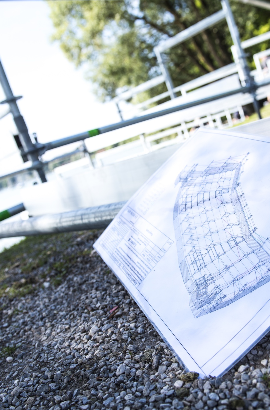 Die Schauspielerinnen und Schauspieler auf der Uttinger Seebühne spielen traditionell ganz ohne technische Verstärkung, was bei einem Open Air Event wie hier direkt vor bzw. in der malerischen Kulisse des Ammersees auch für den Tribünenbau Auswirkungen hat. „Wir haben die gesamte Konstruktion wie ein Amphitheater angelegt, in dem sich der Schall fängt, damit möglichst jeder Besucher optimal verstehen kann. Zudem steht die Tribüne mit den vordersten Stützen direkt im Wasser, um den Besuchern das Gefühl zu vermitteln, sie würden auf dem See sitzen – so bekommt das Stück ‚Im Weißen Rössl (am Ammersee)‘ einen zusätzlichen Reiz“, erklärt Stefan Dankel. Diese besondere Form konnten die Layher Techniker für Event durch die Kombination aus Standard- und Sonderbauteilen realisieren. Die Unterkonstruktion besteht dabei aus dem Layher AllroundGerüst, das sich durch eine hohe Tragfähigkeit und den schnellen und flexiblen Auf- und Abbau auszeichnet. Nicht nur die Tribüne bekommt in Utting nasse Füße, auch das sechsköpfige Team stand beim Aufbau im angenehm kühlen Wasser des Ammersees, um das Bauwerk richtig auszurichten.