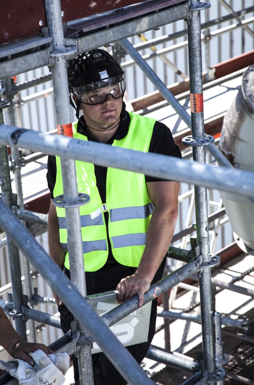 Wenn man die Gerüstspezialisten von QuadreX beobachtet wird sehr schnell klar, dass diese Arbeit nur von extrem gut geschulten Mitarbeitern erledigt werden kann. Beim Materialhandling unter diesen Extrembedingungen ist zudem das Gewicht der Einzelteile ein entscheidender Faktor. Mit den Lightweight Allround-Bauteilen lässt sich hierbei einfacher und sicherer arbeiten. Jeder einzelne Arbeitsschritt will gut überlegt sein, um die eigene Sicherheit nicht zu gefährden. „Wir schicken unsere Männer regelmäßig auf Schulungen zu Layher, um sicherzugehen, dass alle aktuellen Arbeitssicherheits-Vorgaben bekannt sind und jeder im Team weiß wie man ein Gerüst sicher stellt“, ergänzt Postweiler, der selbst seine Ausbildung zum Gerüstbauer als Jahrgangsbester abgeschlossen hat.