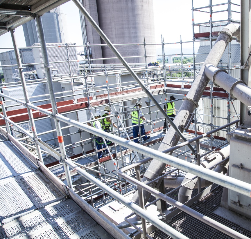 Projekt 1 auf dem Areal war die teilweise Einrüstung einer Materialmühle auf ca. 40 Metern Höhe für die Revision und den späteren Bau einer Einhausung. Hier mussten die Spezialisten von QuadreX mit dem Layher AllroundGerüst Material eine Überbrückungskonstruktion aus AllroundGerüst und Gitterträgern planen und bauen. Zur Unterstützung wurde ein Allround-Turm als Traggerüstkonstruktion gestellt. „In der Anlage herrscht viel LKW-Verkehr, daher müssen wir darauf achten, mit unseren Aufbauten so wenig Platz wie möglich am Boden zu belegen. Mit unserem Allround Material haben wir das Ganze in kürzester Zeit geschafft und so Arbeitszeit sowie am Ende Lohnkosten gespart“, erklärt der Gerüstbauer sein Konzept. Das Layher AllroundGerüst bietet durch die bewährte Kombination von Form- und Kraftschluss und den einfachen Aufbau dank AutoLock-Funktion beste Voraussetzungen.