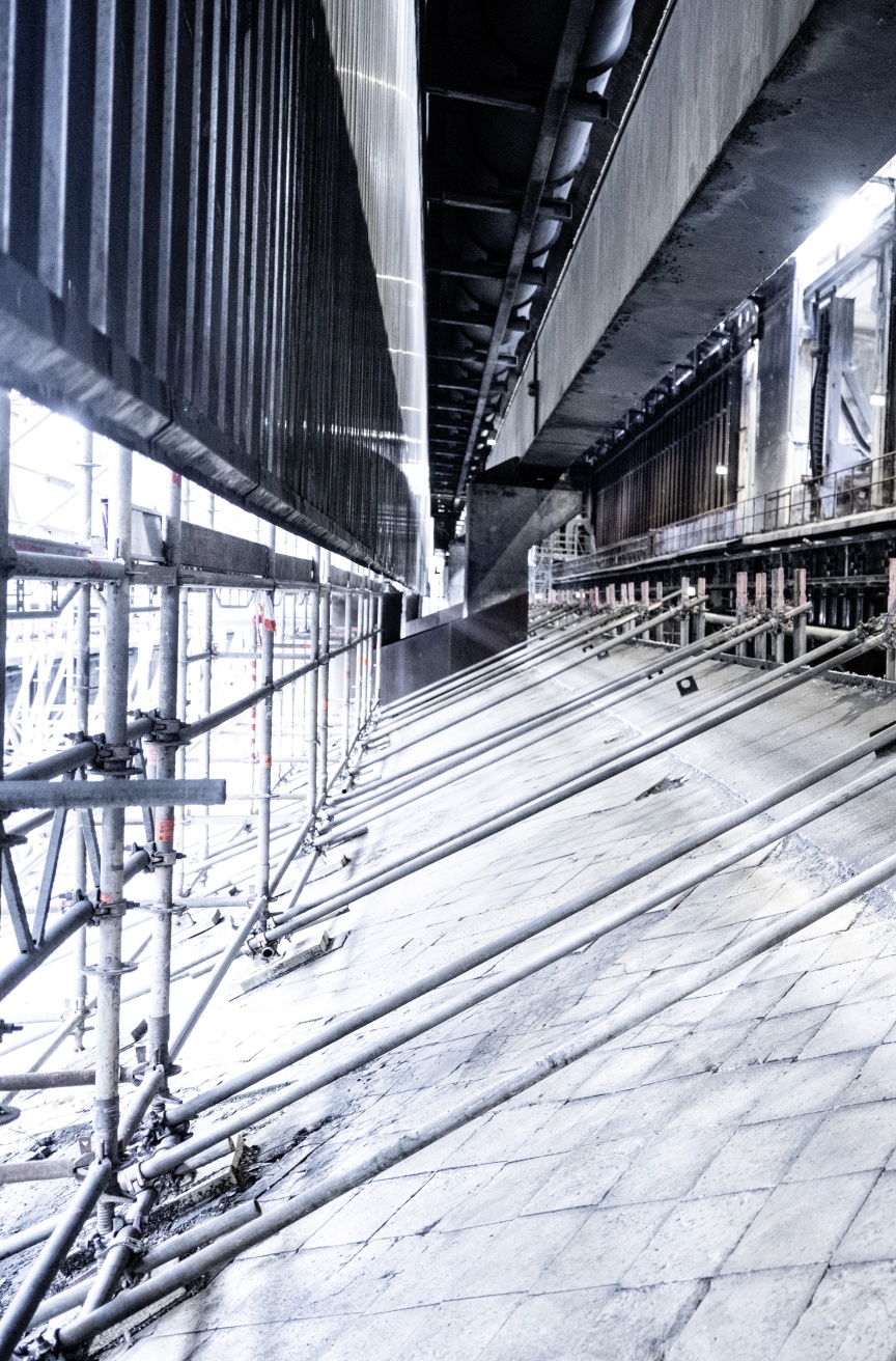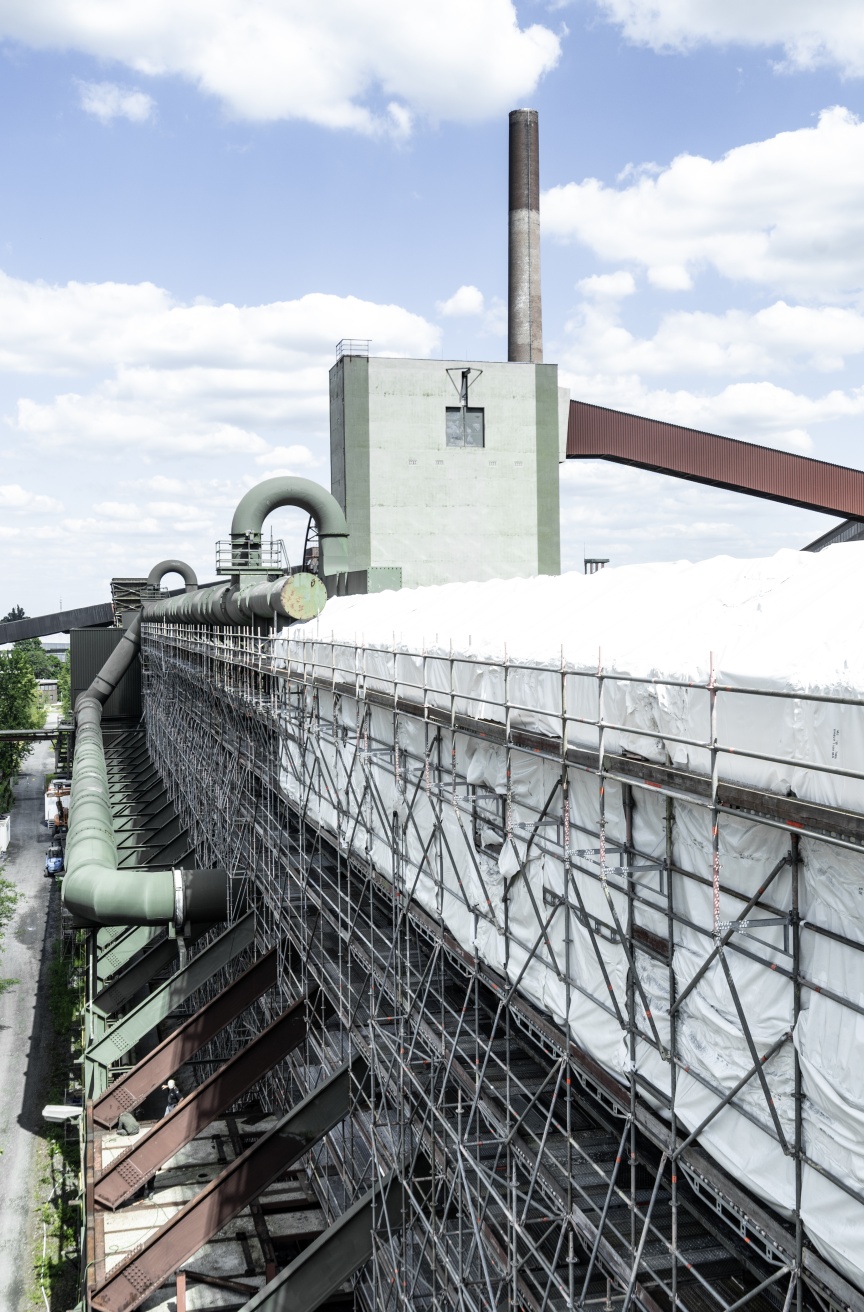Im Inneren der Löschgleishalle wurden hintereinander drei – zum Staubschutz teilweise komplett mit Plane eingehauste – Raumgerüste mit jeweils 8.000 m3 erstellt, um für die Sanierungsarbeiten sichere und gut zugängliche Arbeitsplattformen zu schaffen. Auch hier hielt das Gebäude eine besondere Herausforderung bereit. Parallel zu dem im Inneren verlegten Schienenstrang, auf dem früher riesige Eisenbahnwagen zum Kokstransport von den Öfen zum Löschturm bewegt wurden, verläuft erhöht der sogenannte Meistergang. Von hier konnte der Verantwortliche der Kokerei mit einem kleinen Schienenwagen den gesamten Prozessweg beobachten. Das Raumgerüst durfte hier aufgrund unklarer statischer Eigenschaften des Untergrundes nicht auf dem Boden abgestützt werden, sondern musste mittels Kanthölzern auf den Schienen gegründet werden.