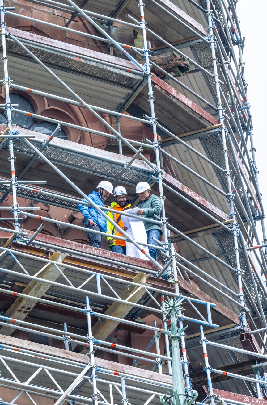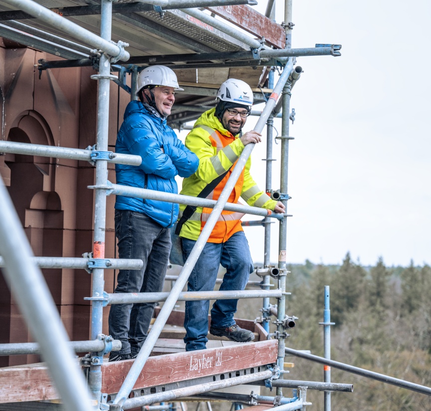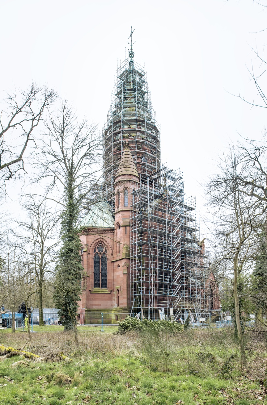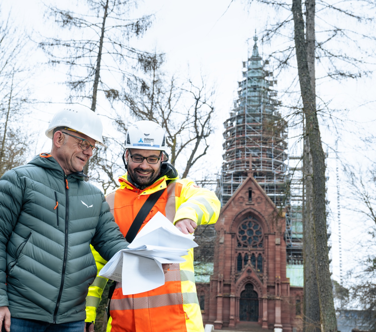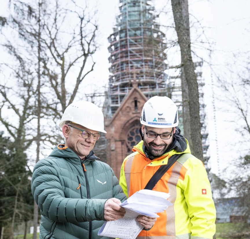 Between 1889 and 1896, the Grand Duke of Baden Friedrich I. and his wife Luise of Prussia commissioned Hermann Hemberger to build a very special edifice in Karlsruhe’s Hardtwald forest, based on preliminary drafts by Hemberger’s father. This neo-Gothic style mausoleum may not be an officially consecrated church, yet it never fails to impress with its architectural details and the proportions of a large place of worship. When refurbishment of the roof and facade of the building could be delayed no longer after 120 years, Burkart Gerüstbau GmbH of Karlsruhe was awarded the contract for the necessary scaffolding work. For Burkart too, just as it did for the architects over a century ago, the issue of generations plays a special role on this particular construction site, being the very last time Peter Burkart and his nephew Christian will be collaborating on a project. As soon as it is over, Peter Burkart will be taking well-earned retirement after almost 40 years as the firm’s joint Managing Director.
