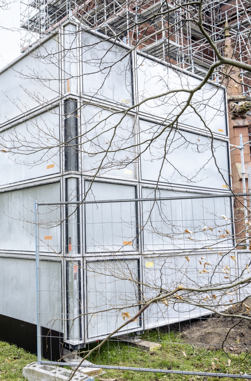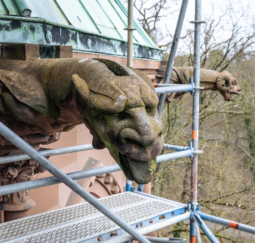 In this particular case, for example, this meant that the tender only envisaged one elevator up to the start of the tower 21 metres above the ground. “Our scaffolding was already complete when we were suddenly informed that a second elevator would be required. It needed to reach from the start of the tower to the start of the roof, to enable the sandstone blocks that must be partially removed from the facade for refurbishing to be transported safely,” explains Christian Burkart, Technical Office Manager. “That was the big chance for us and our Layher Lightweight material to demonstrate once again exactly what we’re capable of.” For the first phase of the project – the refurbishment of the tower – shoring made from Layher Allround material was erected on the long sides of the mausoleum, with access via Layher platform stairtowers to allow safer, faster ascent and descent with tools and work materials.
