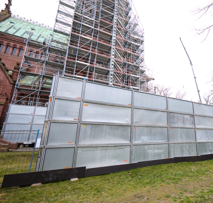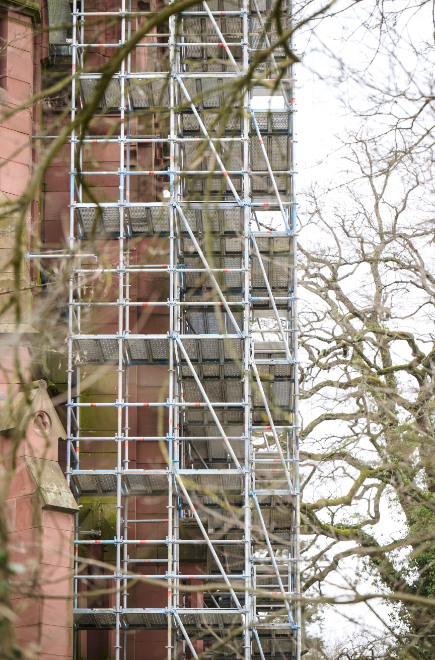 Peter Burkart recalls that the time frame allotted for the project was extremely tight: “When we received the order at the beginning of the year, we had no time to lose, because the scaffolding had to be in place before birds and bats started using the building as a nesting site again in spring.” Local environmental officers checked up on this regularly throughout the construction work before each new step was approved. “What’s more, the sepulchral chapel is located very close to Karlsruhe’s Wildpark stadium, directly on one of the most popular routes among the second division football team’s fans,” his nephew Christian adds. “That’s why we decided on extensive protection against unauthorised access with a high wall of scaffolding material and Layher Protect System elements around the entire construction site, to reduce the risk of accidents and vandalism.” In the second project phase after refurbishment of the tower is completed, the shoring will be converted into work scaffolding for refurbishing of the chapel base.