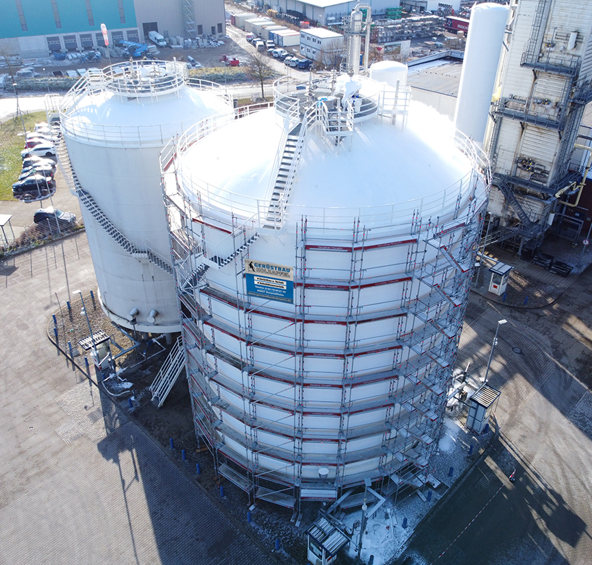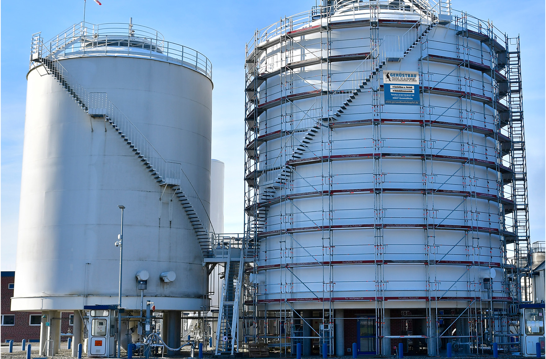 Mit dem modularen Fassadengerüst AGS von Layher konnte die Gerüstbaufirma Holzapfel die für Beschichtungsarbeiten an Sauerstofftanks geforderten Rundrüstungen wirtschaftlich realisieren – und Baustellenanforderungen wie temporäre Podesttreppentürme für sicheren Auf- und Abstieg einfach umsetzen.