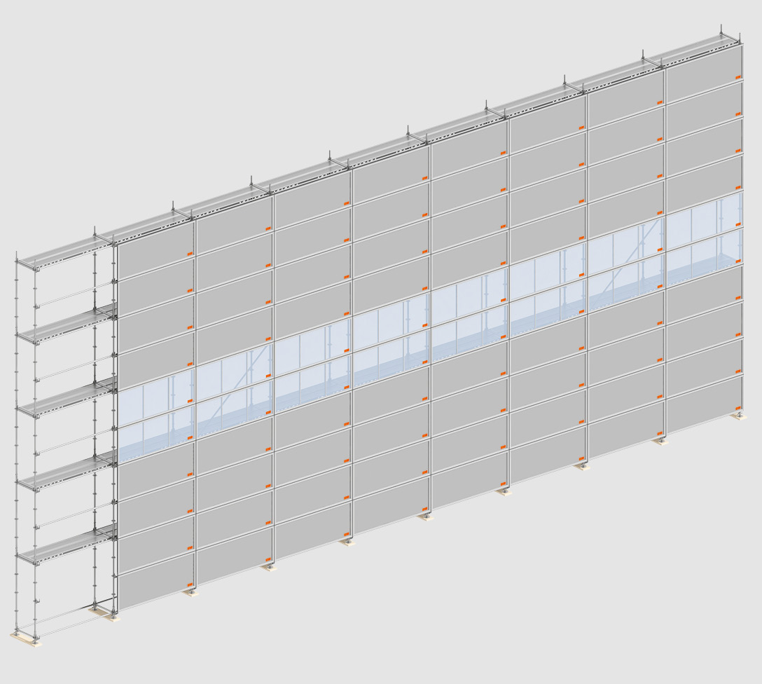 Mit dem Protect-System bietet Layher ein Kassetten-Einhausungs-System passend zum Layher AllroundGerüst und Layher Blitz Gerüst, das den Anforder­ungen an Umwelt­schutz, Lärm­schutz und Wetter­schutz gerecht wird.